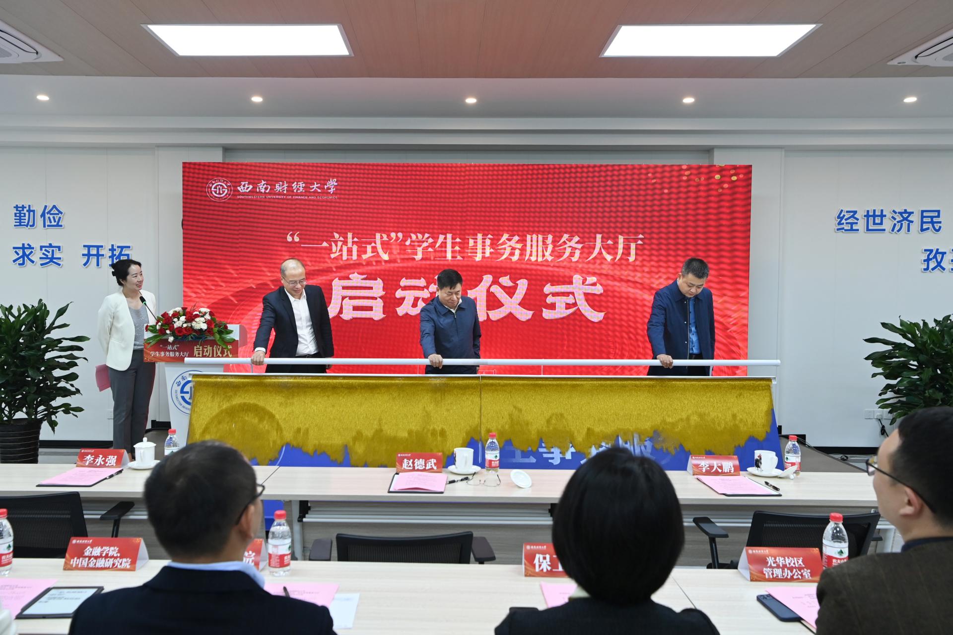 10月31日下午,必赢272net入口光华校区“一站式”学生事务服务大厅正式启动。党委书记赵德武,党委副书记、校长李永强,四川省教育厅宣传思想与统战工作处处长李大鹏出席,共同为服务大厅揭牌。相关职能部门负责人、学院(研究院)学生工作负责人,学生党建指导中心学生党员、第九期学生骨干培训班学员参加启动仪式。与会嘉宾参观了“一站式”学生社区服务大厅各项分场活动开展情况。