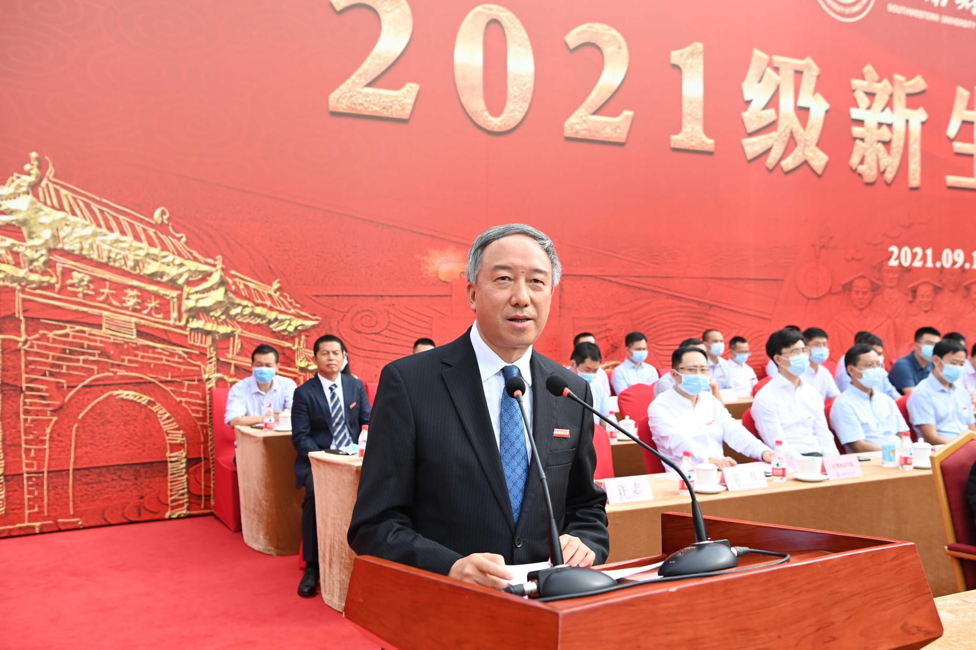 大家上午好!感谢你们如约而至,相会在星河璀璨的蓉城九月,携手开启筑梦必赢、不负韶华的崭新航程。在此,我谨代表全校师生员工,对2021级各位新同学的到来表示最热烈的欢迎!向辛勤养育你们的父母、培养你们的师长、帮助你们的亲友,致以最诚挚的感谢!