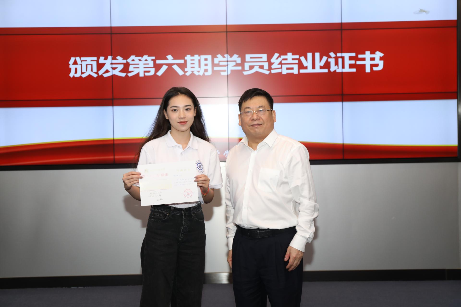 赵德武为第六期学员一一颁发结业证书并合影留念。他在与第六期学员的交谈中对学员们表达了充分肯定和殷切期望,勉励大家锐意进取、奋发图强、追求卓越。他强调,希望学员们牢记“树雄心大志,当时代先锋”的班训,弘扬“经世济民,孜孜以求”的大学精神,立大志、明大德、成大才、担大任,努力成为堪当民族复兴重任的时代新人。