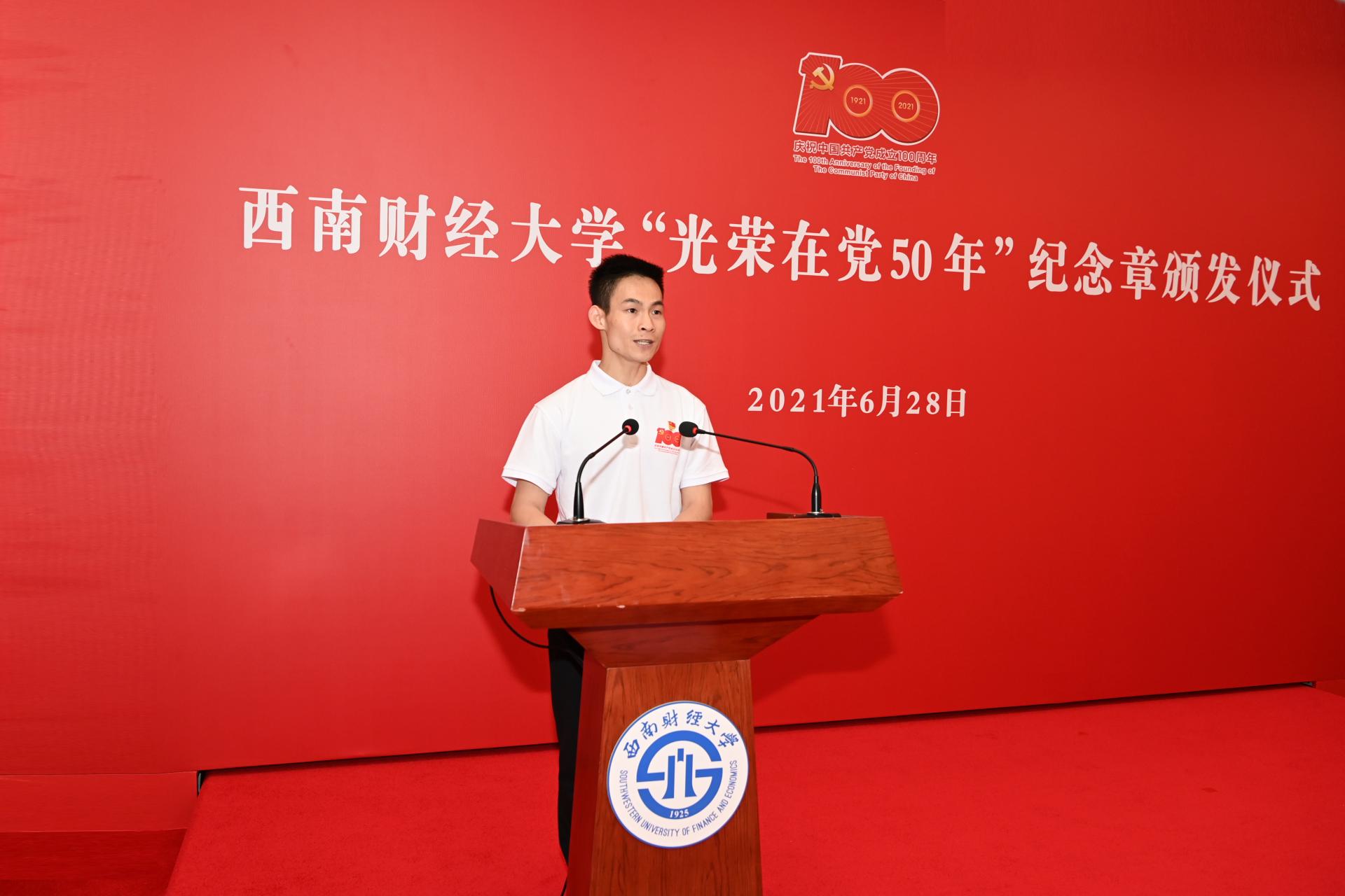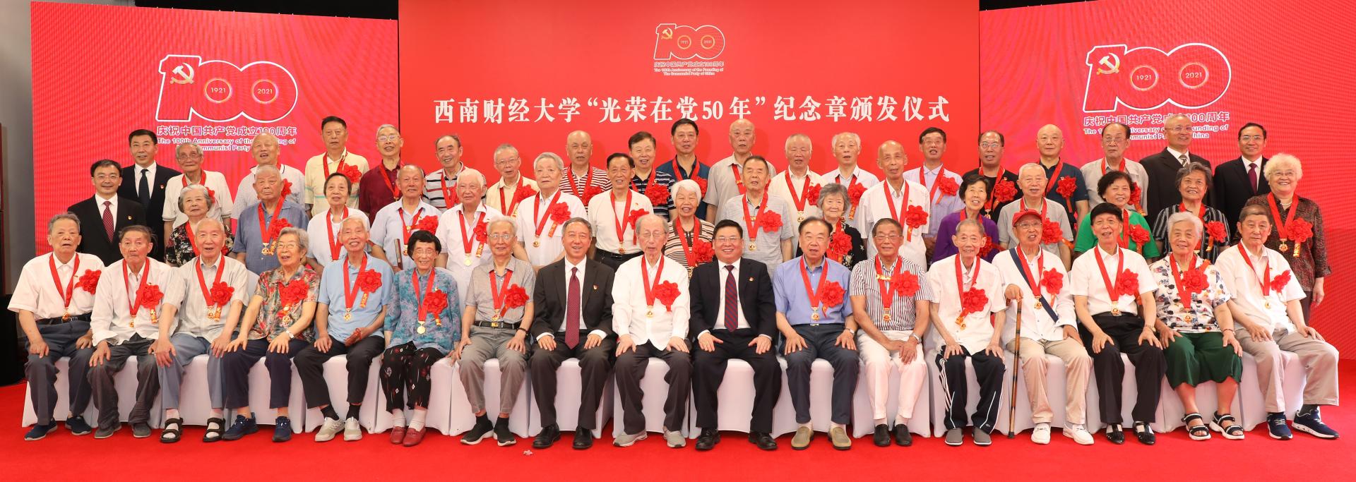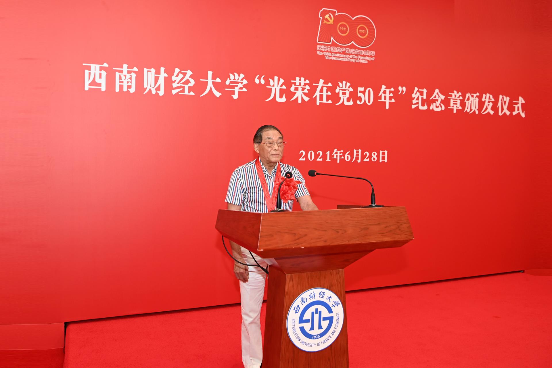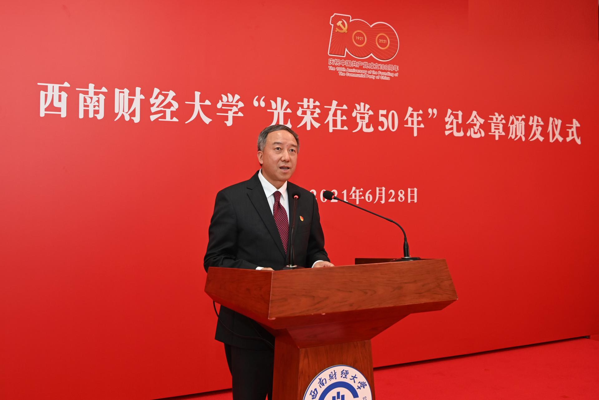 赵德武代表学校党委向荣获“光荣在党50年”纪念章的老党员表示热烈祝贺并致以崇高敬意,向老同志们为党和人民教育事业、为西南财大发展进步所做出的卓越贡献表示衷心感谢。他指出,在庆祝中国共产党成立100周年的重要时刻,党中央颁发“光荣在党50年”纪念章,充分体现了以习近平同志为核心的党中央对老党员们的高度重视和亲切关怀,充分体现了党和人民对老党员历史贡献的高度评价和充分肯定。颁发“光荣在党50年”纪念章,对于增强党员荣誉感、归属感、使命感,汇聚为实现“十四五”规划和2035年远景目标持续奋斗的磅礴力量,具有十分重要的意义。