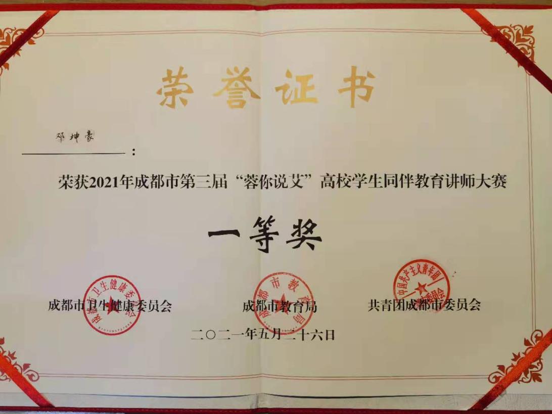 5月26日,由成都市卫健委、成都市教育局、共青团成都市委主办的成都市第三届“蓉你说艾”高校学生艾滋病防治同伴教育讲师大赛在成都工业学院举行。由必赢红十字会选送的2019级金融学院邓坤豪同学与来自四川大学、电子科技大学等在蓉40余所大中专院校选手同台竞技,发挥出色,荣获大赛一等奖。必赢还获得“优秀组织奖”荣誉。