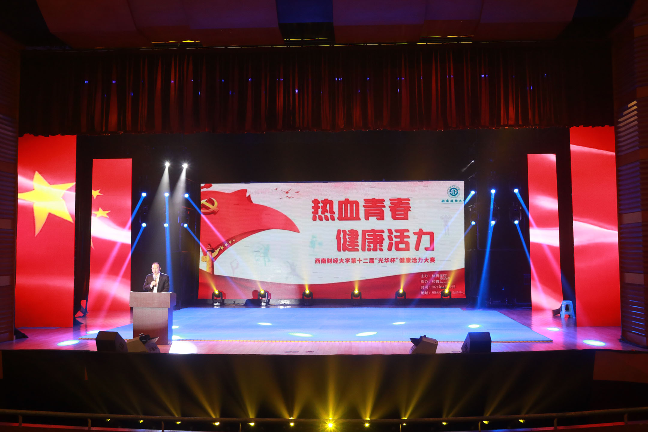 4月29日晚,学校第十二届“光华杯”健康活力大赛汇报演出暨颁奖晚会在学生活动中心800人厅隆重举行。党委副书记曾道荣,党委常委、副校长李永强,相关职能部门和学院(中心)负责人,体育学院全体教职工、获奖同学代表等参加晚会。