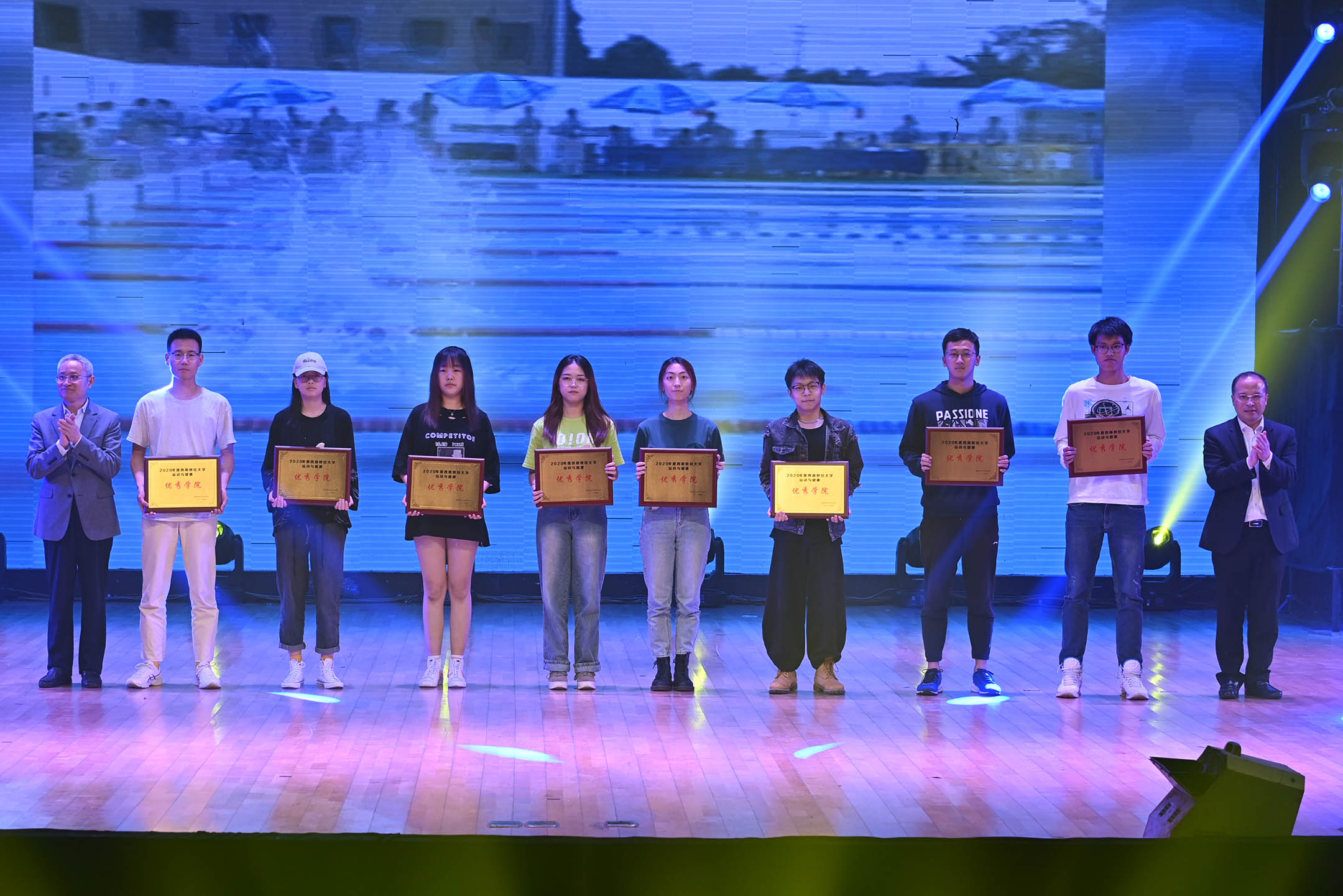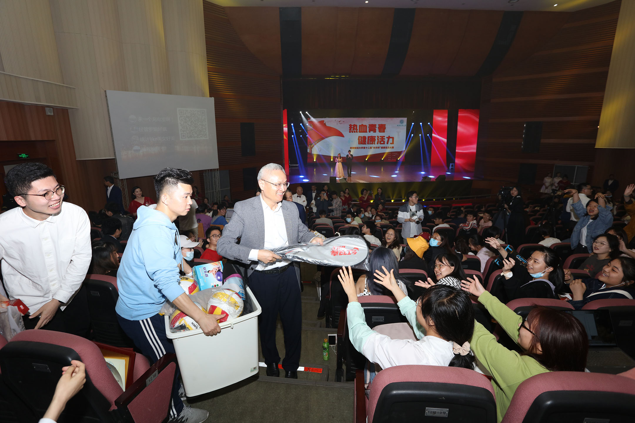 晚会为大家呈现了一台健康活力的视听盛宴,学校领导、职能部门及学院(中心)负责人为获奖单位和个人颁奖,校领导还走向观众席与师生互动,送出大量健身器材,鼓励正当青春的同学们积极参加体育锻炼,在运动中燃烧激情、在阳光下绽放青春。