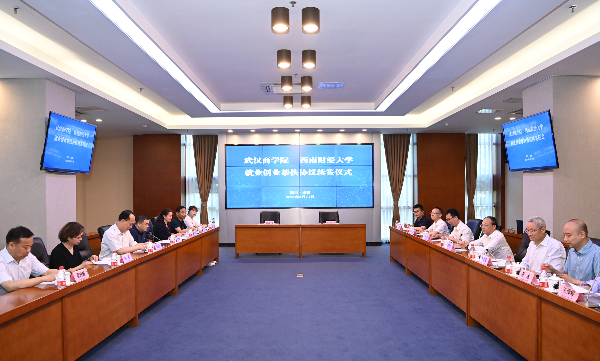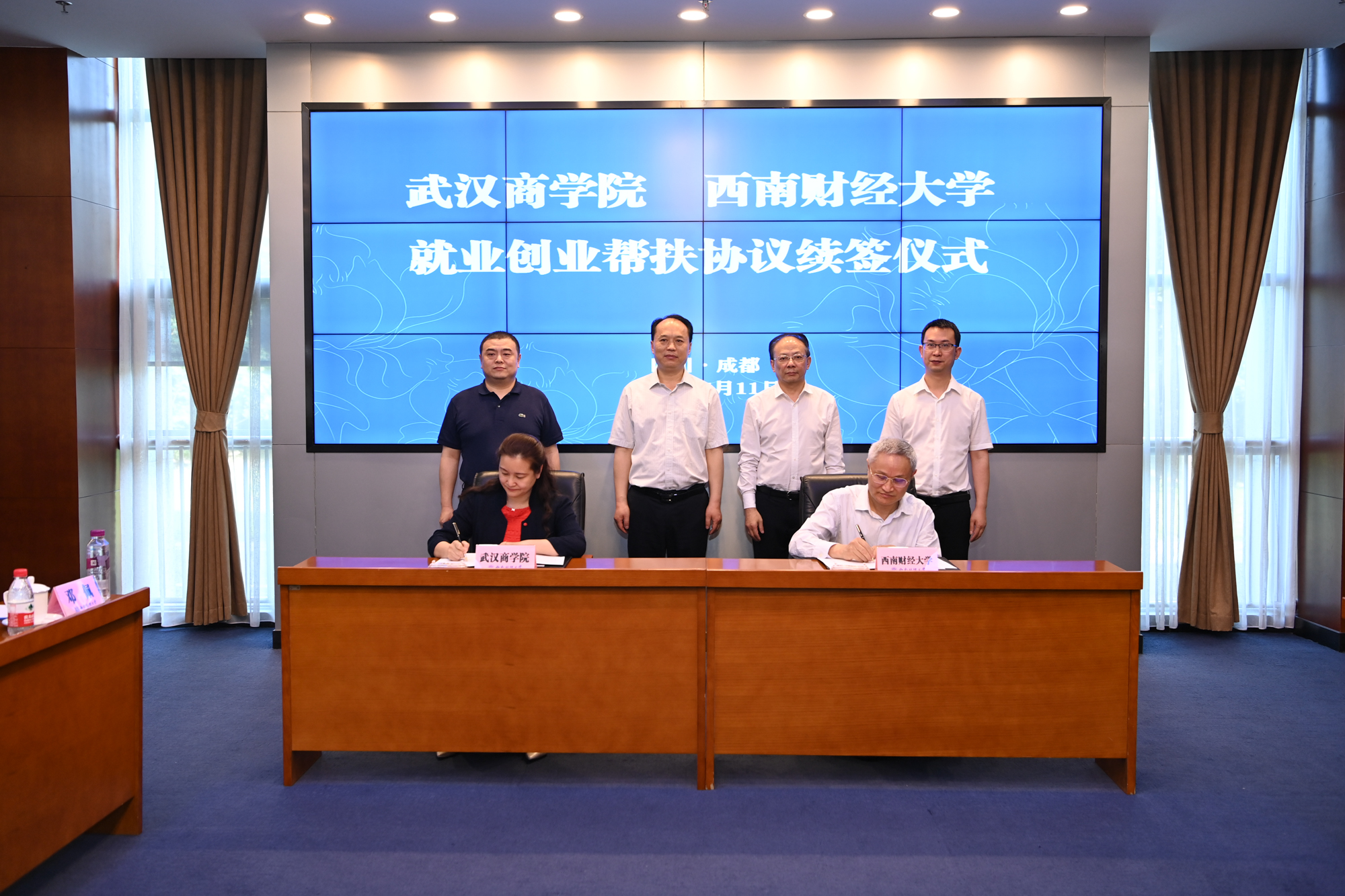 5月11日上午,必赢272net入口与武汉商学院就业创业帮扶协议续签仪式在柳林校区弘远楼109会议室举行。校党委副书记曾道荣、武汉商学院副校长刘佳霓代表两校签订了协议。湖北省教育厅副厅长张金元、四川省教育厅副厅长戴作安及相关负责同志见证了签约仪式。