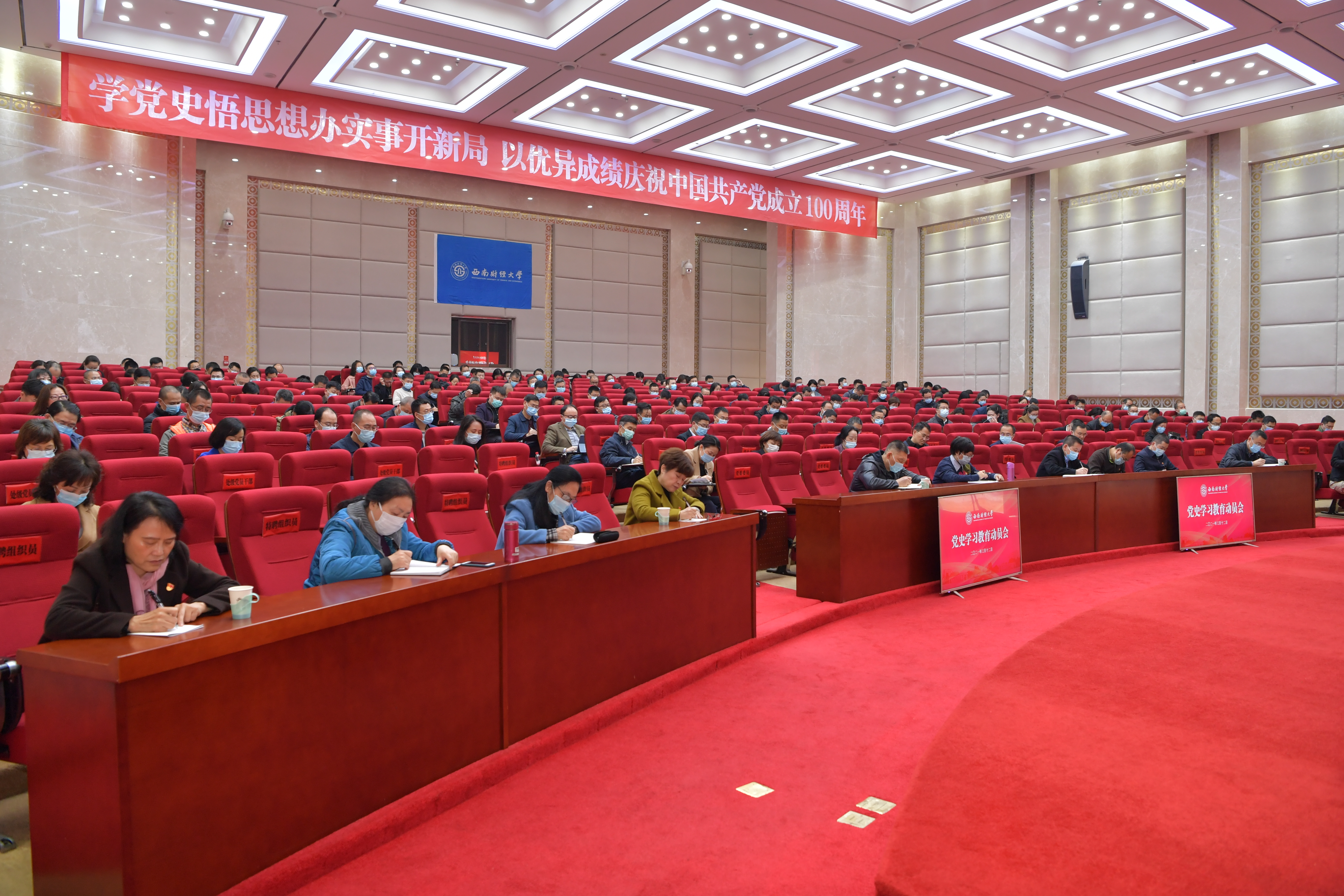 赵德武在讲话中指出,在喜迎中国共产党成立100周年之际,在全党开展党史学习教育,是以习近平同志为核心的党中央立足党的百年历史新起点、统筹中华民族伟大复兴战略全局和世界百年未有之大变局、为动员全党全国满怀信心投身全面建设社会主义现代化国家作出的重大决策。习近平总书记在党史学习教育动员大会上的重要讲话,高屋建瓴、视野宏大、思想深邃,深刻阐述了开展党史学习教育的重大意义,深刻阐明了重点任务和工作要求,对新时代学习党的历史、弘扬党的传统、开启新的征程、创造新的伟业作出重要部署,为我们开展好党史学习教育指明了方向、提供了根本遵循。结合学校96年来形成的光荣革命传统和厚重的红色基因,赵德武强调,全校各级党组织和广大党员、干部要深刻领会党史学习教育“三个必然要求”的重大意义,切实增强政治自觉,从党的奋斗历史中汲取经验智慧和前进力量,从党的非凡历程中读懂强党之路,在新的历史起点奋力推动学校事业新发展。