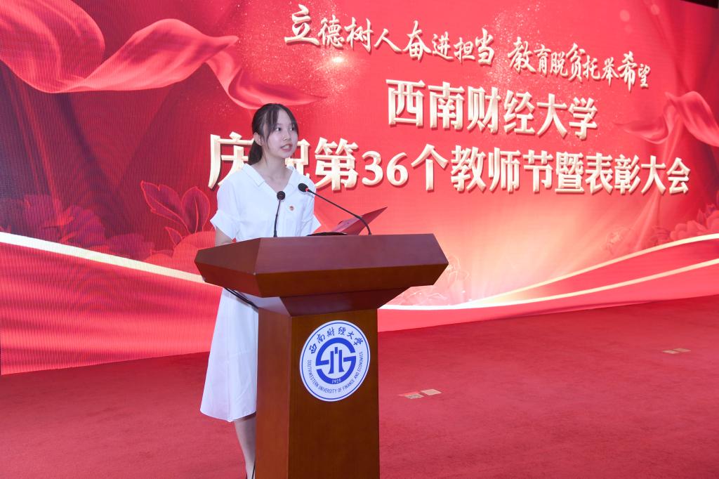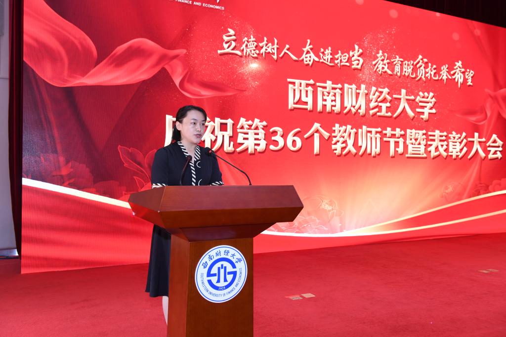 教师代表王朝明、李越冬、瞿丽先后发言,分享自己在教学科研、管理服务岗位上立德修身、恪尽职守的心得体会,讲述抗疫期间坚守岗位、挺身而出的亲身经历,表达对学校的感激和热爱之情。他们表示,将不忘初心、砥砺前行,塑造优良的师德修养,践行立德树人教学理念,为加快建设国际知名财经特色鲜明高水平研究型大学做出自己的贡献。