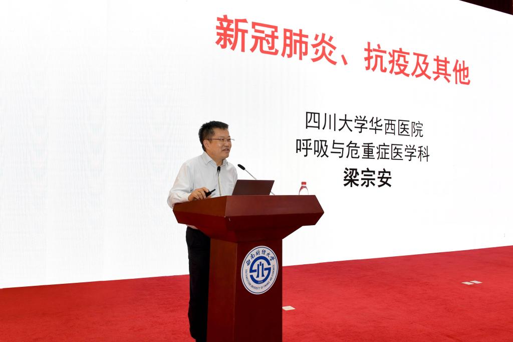 9月29日下午,“青春在战疫中绽放”——开学第一堂团课在弘远楼105会议室举行。学校党委副书记曾道荣,全体团干部,主要学生组织负责人,2019级、2020级全体团支书等400余人在现场参加了主题团课;部分学院组织团支部、第22届研究生支教团组织当地学生通过线上直播形式参与了团课,共3800余名团员青年聆听团课。团课由全国优秀共产党员、全国抗击新冠肺炎疫情先进个人、四川大学华西医院呼吸与危重症医学科主任梁宗安教授主讲。