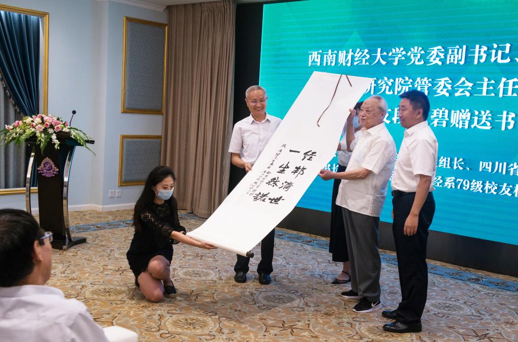 四川省决策咨询委员会农业组组长、农经系79级校友杨新元和曾道荣向段应碧赠送“经邦济世 一生然诺”书法作品,对段应碧一直以来关心支持学校建设发展,践行“经世济民,孜孜以求”必赢精神,为我国三农事业发展所做出的重要贡献表示衷心感谢。