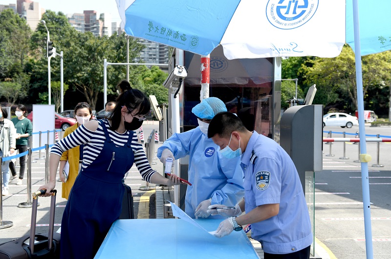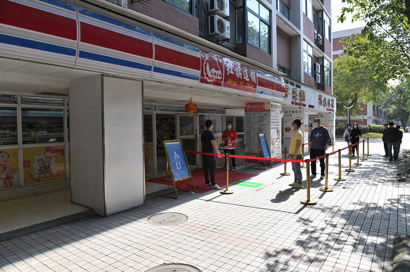 在演练现场,随处可见清晰明显的提示展板和耐心解答的工作人员,参加演练的人员根据引导有序排队、积极配合。柳林校区南大门外,演练人员根据展板提示主动出示健康二维码,配合工作人员完成行程查验、行李消毒和口罩更换,间隔排队进入热成像体温筛查区测量体温,如实进行流行病学调查登记,领取学校精心准备的防疫物资“爱心包”并进入校园。梅园学生公寓门口,热情的楼妈们站成一排迎接久别重逢的同学,学生们依次间隔排队进行身份验证、健康卡复核和体温检测。在经世楼教室,同学们严格遵守单向通行和隔位就坐,认真学习返校开学第一课。在五谷堂,同学们按照“七步洗手法”完成餐前清洁,在“回”字形通道间隔排队错峰购餐。超市门口,前来购物的同学间隔排队、主动消毒,工作人员及时有效控制进入超市内人数,引导学生有序购物。