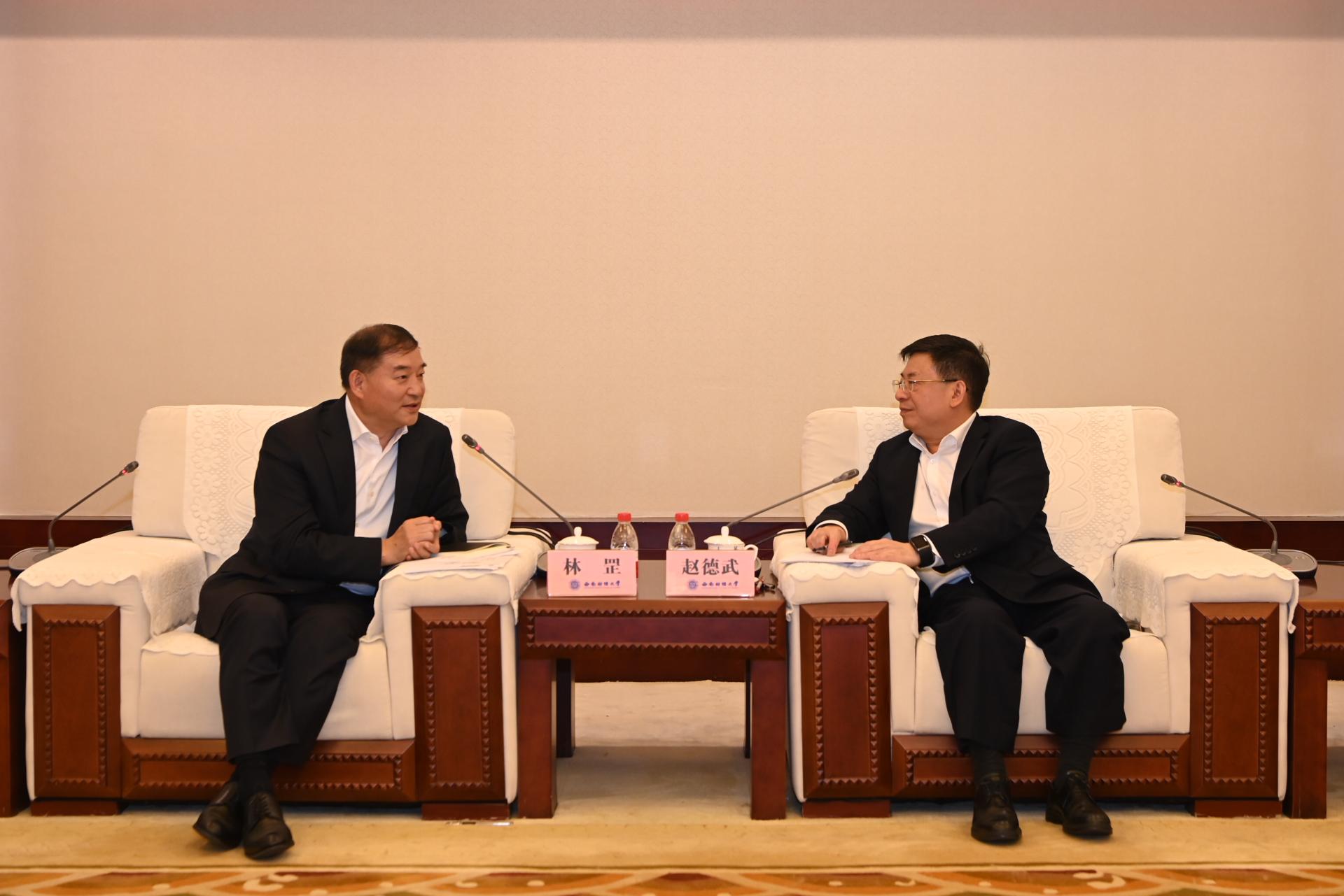 赵德武对林罡一行表示热烈欢迎。他介绍了学校的历史沿革、基本概况与办学特色,重点介绍了学校以全面推进“新财经”战略升级为战略牵引,以一流学科培优和财经科技创新为战略重点,以人才引领发展为战略支撑,引领高等财经教育创新发展的办学实践和改革探索。他表示,此次战略合作协议的签订是双方深入学习贯彻落实中央金融工作会议精神和省委十二届四次全会精神的一致行动,对于更好地服务国家战略、争创一流、推动高质量发展具有重大而深远的意义,并围绕助推金融高质量发展、服务四川现代化建设、加强人才交流等方面提出三点合作建议。