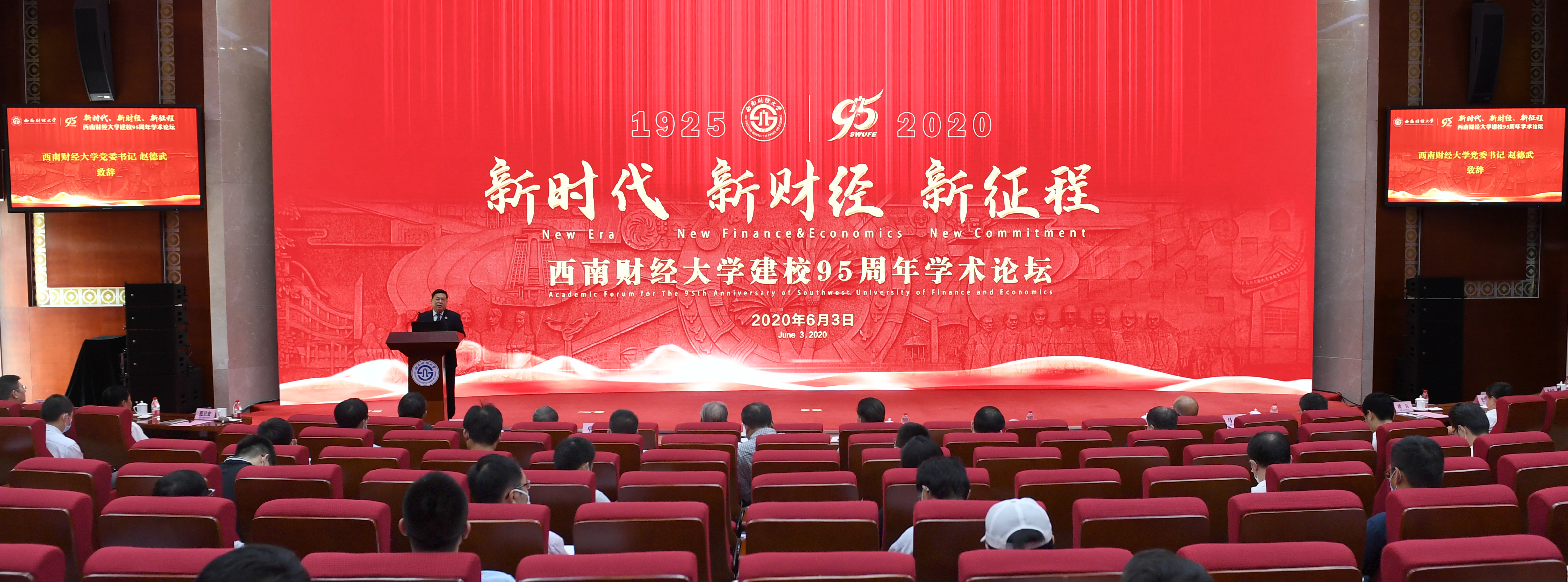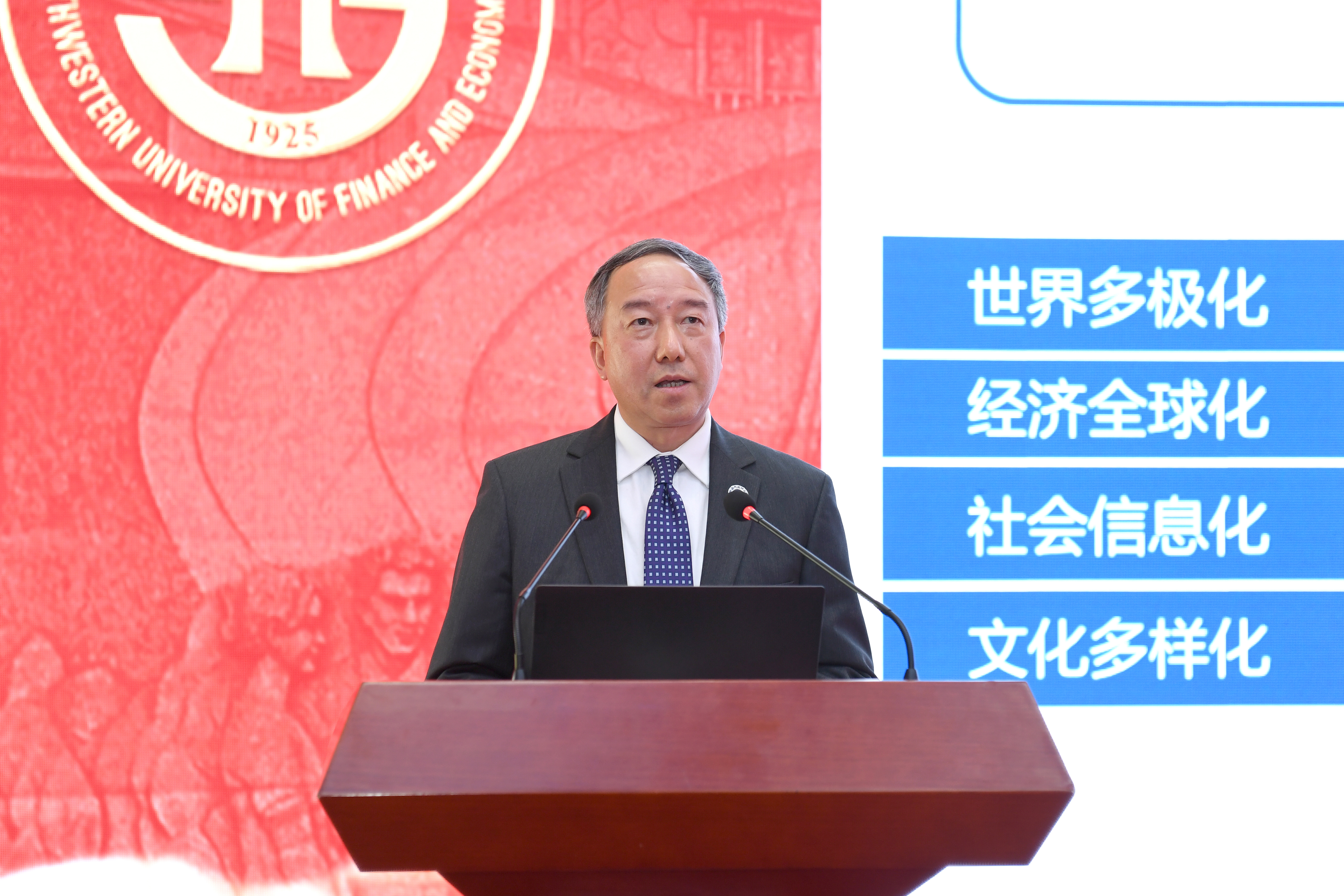 赵德武在致辞中代表学校向出席论坛的嘉宾表示热烈欢迎和衷心感谢。他指出,建校95年来,西南财大扎根中国大地,站在学术前沿,积极回答和解决我国经济社会发展中的重大理论和实践问题,成为推动我国哲学社会科学理论创新和实践发展的重要力量。中国特色社会主义进入新时代,西南财大认真把握经济高质量发展、建设高等教育强国、现代科技发展对高等财经教育的深刻变革和深远影响,率先提出“主动适应新文科、主动引领新财经”,深入探索新时代高等财经教育的创新发展。赵德武强调,新财经背景下,高等财经教育如何建立与现代化经济体系相适应的人才培养新体系,更好服务国家和区域发展战略;如何主动适应现代科技对学科、课程、专业、教材的变革影响,进一步推动财经科学思维创新、技术创新、方法创新和组织创新;如何在建设高等教育强国的历史征程中走在前列,在积极参与国际合作与竞争中建设中国特色、世界一流;如何妥善应对后疫情时代带来的机遇与挑战,于危机中育新机、在变局中开新局等问题亟待我们共同给出答案。赵德武表示,西南财大愿与各界朋友一道,为构建中国特色哲学社会科学体系、推动中国经济高质量发展、建设高等教育强国作出新的更大贡献。