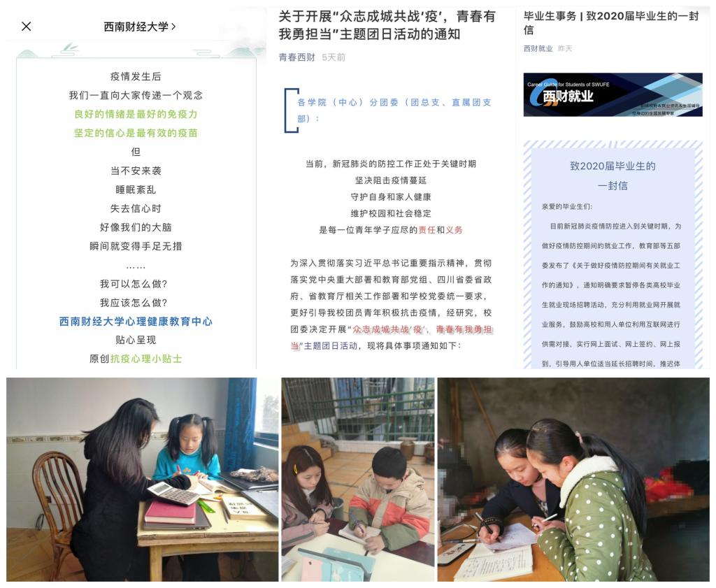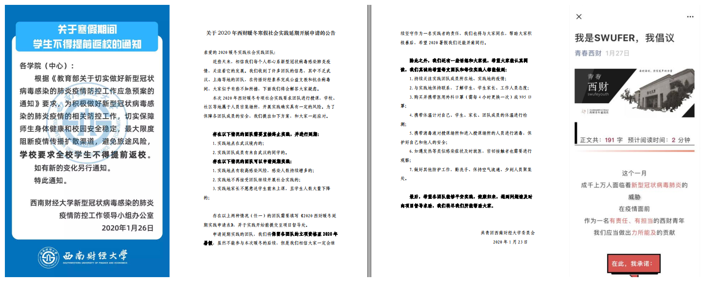 全员联动,宣传科普广覆盖。积极通过微信公众号、网页、学生QQ群与微信群等,开展科普宣传、学生关爱教育和引导教育,及时将学校的关心关爱、学校的安排和要求转达给每位必赢学生,带领学生打赢防疫战。学校疫情防控领导小组及时发布《关于全面暂停必赢2020年必赢社会实践的通知》《关于寒假期间学生不得提前返校的通知》等疫情防控通知,做好疫情防控期间的学生事务服务,最大限度阻断疫情传播扩散渠道。以辅导员关怀、学生自我教育、典型引领示范的方式,引导学生加强自我保护,理性辨别谣言,传播正能量。发起“我是SWUFER,我倡议”,号召全校学生齐心协力,共克时艰,近13000余人参与。
