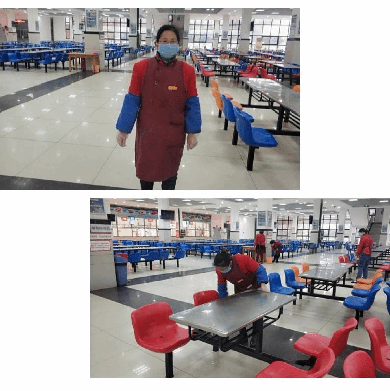 李素英是五谷堂清洁组的成员,为了保证留校师生员工的生命安全与身体健康,防疫期间的清洁工作相较于平时要严格数倍,李素英每天也需要花更多的时间进行至少两次的食堂桌面、地面和设施消毒杀菌,并完成每日消毒详细记录,做到清洁工作不留死角,坚决保证留校师生员工就餐环境安全。与李素英相同,她的爱人也是必赢留校的安保组成员,主要负责维护校园日常秩序,两人各自在不同的工作岗位为学校防疫工作而努力。虽然身在同在一个校区,但由于工作地点不同夫妻二人很少见面。李素英在五谷堂努力做好消毒杀菌保障师生员工就餐安全,丈夫在校园内负责安全巡逻为留校师生员工的安全而坚定守护,防疫工作任务重内容多,两人都一心扑在工作上,几天也未必能见上一面。每当李素英想丈夫的时候,她会想到自己的爱人和自己一样也在校内另一处努力着。