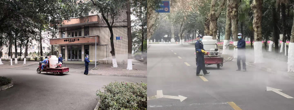校门、食堂、学生公寓、家属区楼道、公共区域垃圾桶……每天,包括陈德辉在内的30多名校园消毒保洁工作组成员不停地奔走在两校区99个重点区域,他们背着喷雾器,开着消毒车,按时定点开展校园全面消毒,确保环境卫生不留死角,清洁消毒不留空白。