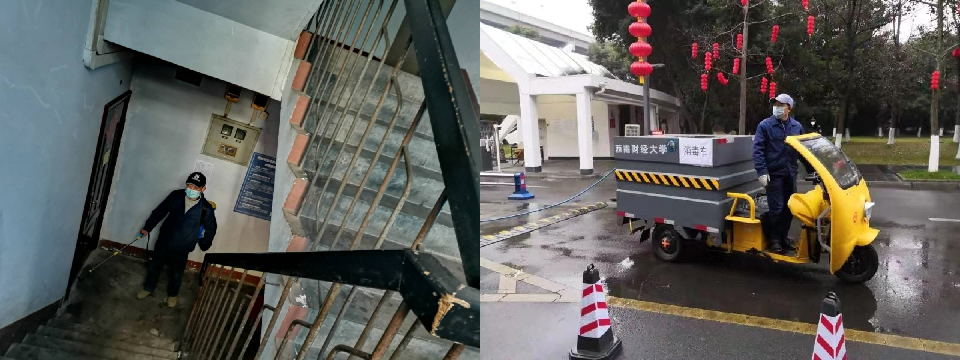 走在西南财大校园内,防疫宣传标语直观醒目,眼中的假期校园却是另一种景象。每天,后勤绿化部员工陈德辉都要背着60多斤重的喷雾消毒药水,一步一个脚印,穿梭在六层楼高的家属区,为他负责的17个单元楼道进行两次消毒。今年52岁的陈德辉原本是光华校区的绿化工,为响应学校疫情防控的需要,他在做好校园绿化工作的同时,又额外承担起光华校区公共区域的消毒任务。从农历大年初三至今,陈德辉已经一个多月没离开过光华园。