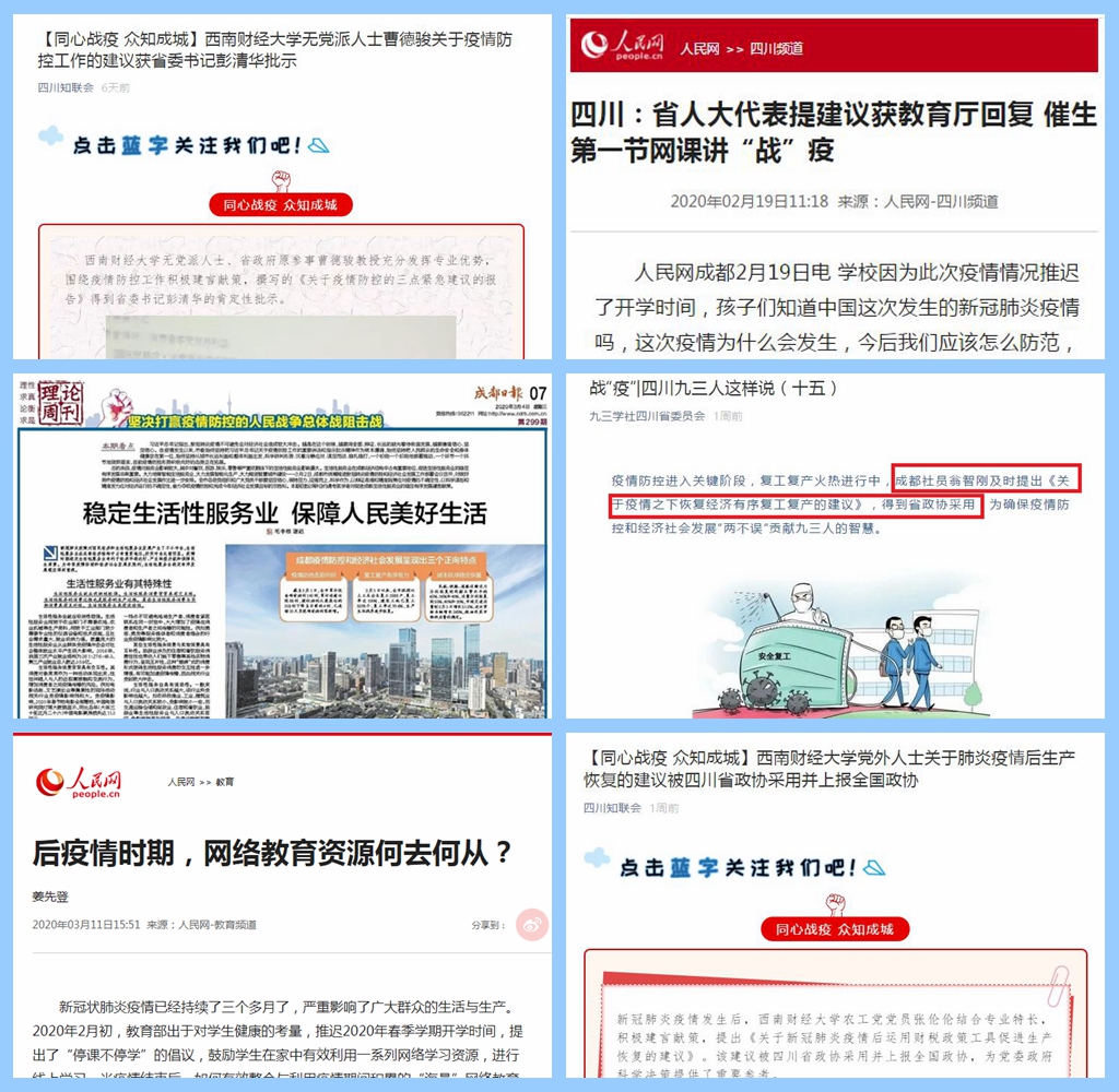 成都市政协委员、九三学社西南财大支社主委翁智刚教授提出《关于疫情之下恢复经济有序复工复产的建议》,获四川省政协采用。九三学社西南财大支社委员姜先登副教授撰写的疫情建言文章《后疫情时期,网络教育资源何去何从?》被人民网全文刊登。