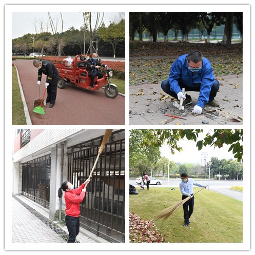 上午九点半,党委书记赵德武,校长、党委副书记卓志分别带领校领导班子成员、中层干部和师生代表,戴好口罩,戴上手套,拿起工具,对两校区公共区域实行分组包干大扫除。清洁地面、清理落叶、清除淤泥、清扫垃圾,20个工作组分片、分散劳动,合力打扫校园主干道、绿化带、校内水域、学生宿舍、停车场等室外区域,细致消毒宿舍、食堂、办公室、厕所等室内场所,作业区域覆盖教职工办公室、留校学生公寓、职工宿舍、食堂、广场、厕所、地下排水沟渠等,维护校内环境卫生、干净、整洁,校园里随处可见埋头苦干、挥汗如雨的卖力身影。