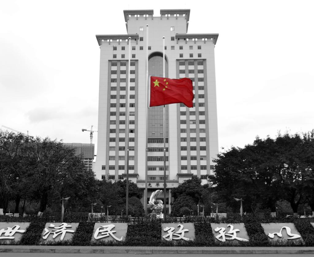 清明节的光华校区北大门庄严肃穆,光华楼前的国旗下半旗志哀。全体人员神色凝重,面向国旗默然肃立。10时整,防空警报和汽车笛号齐声鸣响,大家向抗击新冠肺炎疫情斗争牺牲烈士和逝世同胞默哀3分钟。