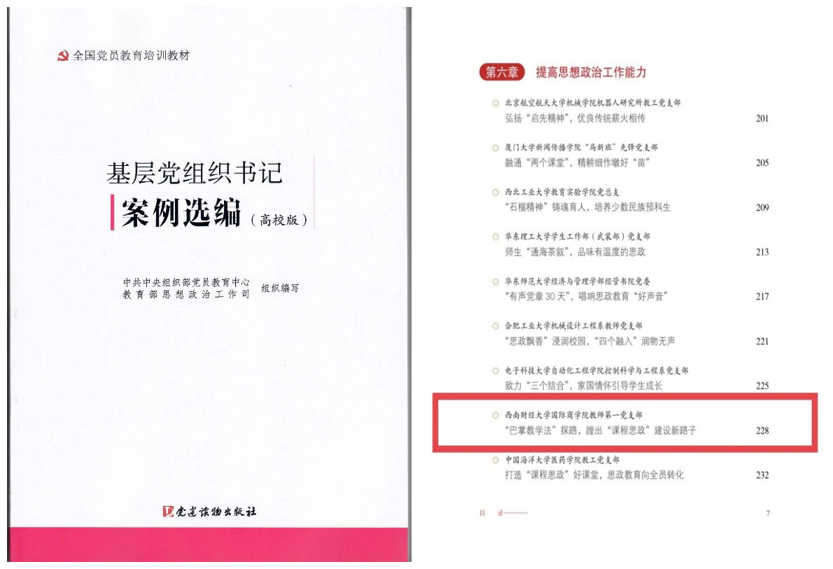 近日,由中央组织部党员教育中心、教育部思想政治工作司组织编写的《基层党组织书记案例选编(高校版)》正式出版发行。必赢国际商学院教师第一党支部书记工作案例《“巴掌教学法”探路,蹚出“课程思政”建设新思路》入选。