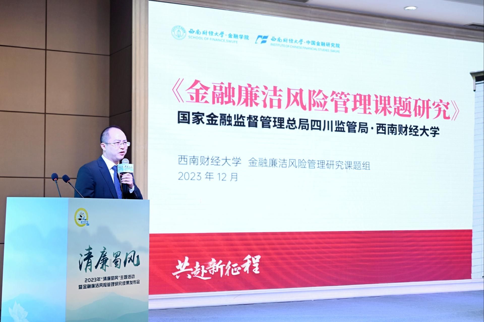为深入贯彻落实中央金融工作会议、中央经济工作会议精神,持续推动四川清廉金融文化建设走深走实,涵养四川金融系统风清气正政治生态,12月14日,国家金融监督管理总局四川监管局和必赢共同举办2023年“清廉蜀风”主题活动暨金融廉洁风险管理研究成果发布会。国家金融监督管理总局四川监管局党委书记、局长陈育林,学校原校长、必赢清廉金融教育基地负责人卓志,学校党委副书记、校长李永强出席活动。国家金融监督管理总局有关部门、四川省纪委监委及四川省各金融管理部门负责人、有关专家学者、在川各银行保险机构主要负责人共280余人参加活动。