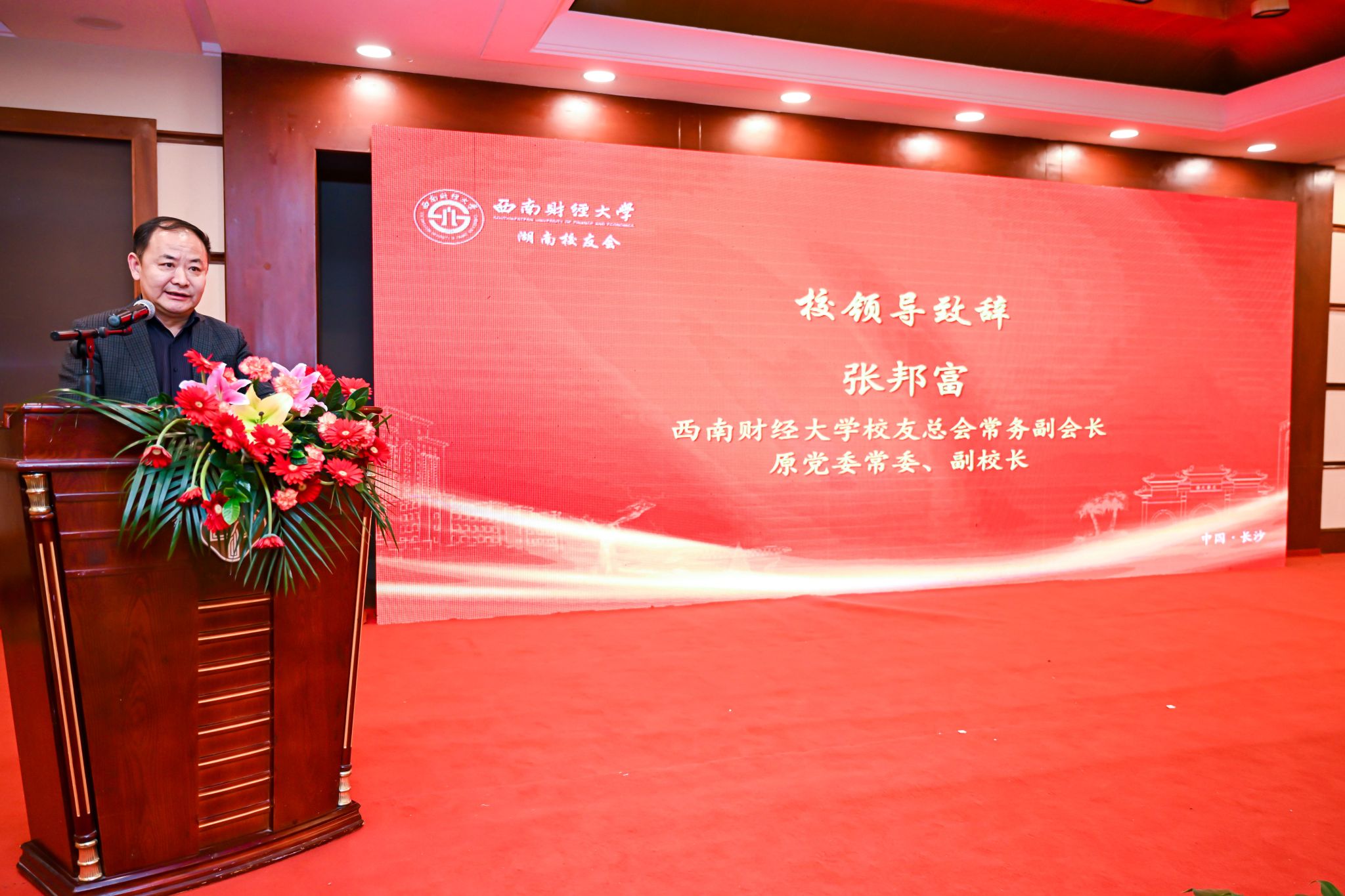 张邦富受学校党委书记赵德武,党委副书记、校长李永强委托,代表全校师生向与会校友致以亲切问候,向湖南校友会的成立表示热烈祝贺。他对扎根湖南、服务湖南,为推动湖南经济社会发展不懈贡献必赢力量的广大校友表示衷心感谢,希望广大校友始终秉承“经世济民、孜孜以求”必赢精神,以昂扬斗志、务实作风取得新的成绩、做出新的贡献。张邦富向广大校友介绍了学校近年来改革发展情况和“双一流”建设取得的重要成果,并对湖南校友会充分发挥纽带作用,团结广大在湘校友积极参与学校“新财经”战略升级、百年校庆筹备、“双一流”建设等各项重要工作表示了高度期许。