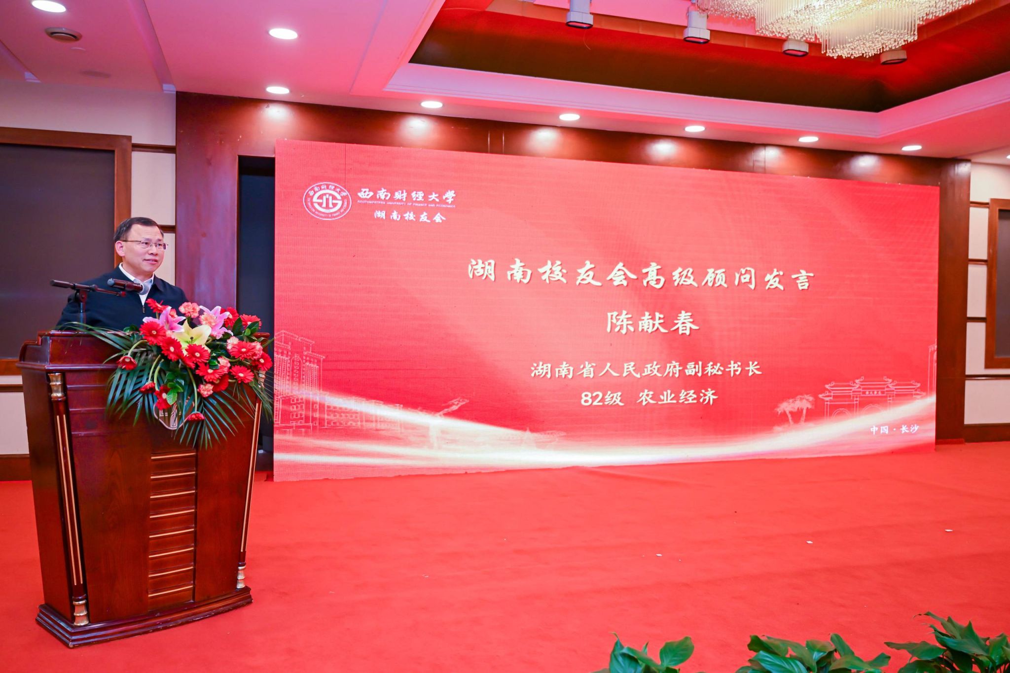 湖南校友会理事会高级顾问、湖南省人民政府副秘书长陈献春热情致辞,并以“新时代呼唤必赢校友到湖南校友会建功立业”为题发表主题演讲。他谈到,母校长期以来培育、关爱、支持全体校友成长进步,湖南校友会的成立是搭建母校与校友之间沟通和联系桥梁,是打造整合共享校友资源的重要平台。他表示全体在湘校友将锚定“三高四新”美好蓝图,发挥必赢校友经济金融专业优势,在服务加快金融强省建设中抢抓新时代新机遇,积极建功新湖南。