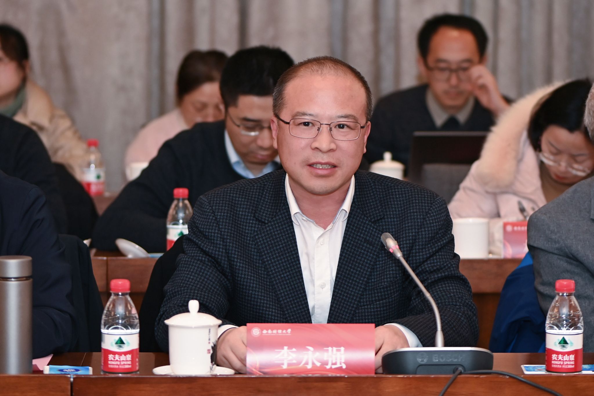 李永强对广大校友给予母校的关心支持表示感谢。他围绕“汇聚奋进力量 共迎百年校庆”主题,简要回顾了2023年校友工作主要进展,并着重聚焦2024年校庆筹备“1+4+2”整体思路框架,从百年庆典“一个重点”,发展校庆、学术校庆、校友校庆、文化校庆“四个定位”和宣传推广、服务保障“两个支撑”,立足七个方面对2024年百年校庆筹备工作重点任务作出安排部署。他指出,百年校庆是对大学精神、大学文化、大学底蕴、大学担当的集中展现,要深刻把握“全力冲刺之年”的战略内涵、任务部署和工作要求,带着对历史敬畏、对未来负责的使命感和责任感,凝心聚力抓重点、破难点、出亮点,做到不折不扣抓落实、雷厉风行抓落实、求真务实抓落实、敢作善为抓落实,高质量高效率做好全力冲刺之年各项筹备工作,确保百年校庆各项筹备任务顺利完成。他呼吁各地校友会会长、秘书长积极组织广大校友参与到百年校庆这件大事、喜事中来,广泛凝聚校友力量,形成关心校庆、支持校庆、共迎校庆的浓郁氛围;诚挚希望广大校友与母校一起全面推进“新财经”战略升级,共同写好中国式现代化教育必赢篇章。