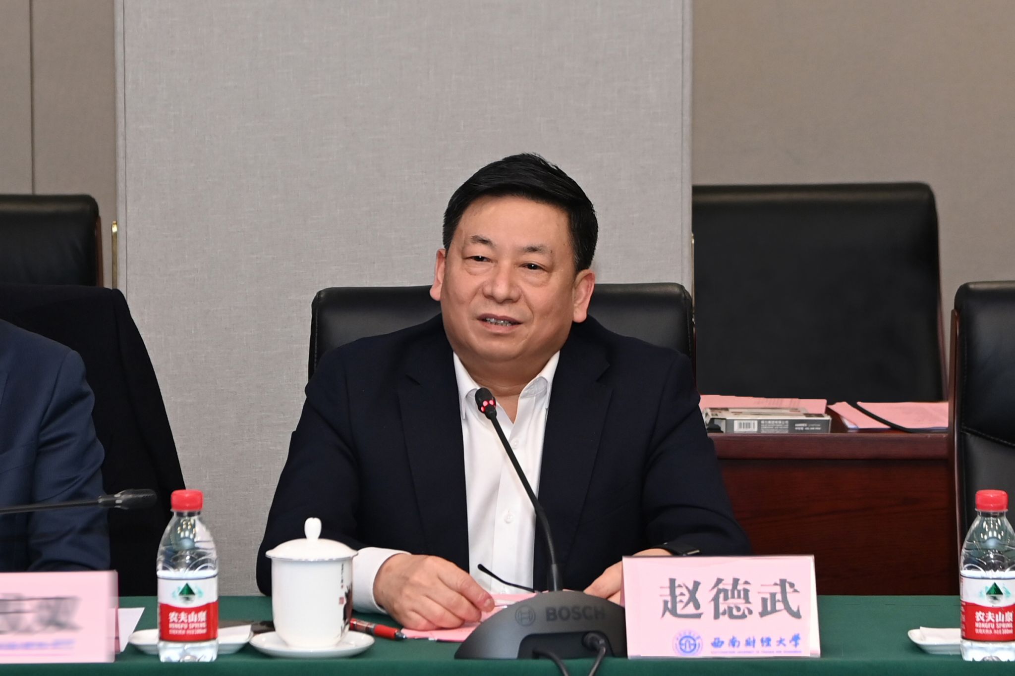 赵德武对文云英一行来校表示热烈欢迎,并对四川音乐学院长期以来对学校的关心支持表示衷心感谢。他介绍了学校的历史沿革、基本概况与办学特色,重点介绍了学校以全面推进“新财经”战略升级为战略牵引,以一流学科培优和财经科技创新为战略重点,以人才引领发展为战略支撑,引领高等财经教育创新发展的办学实践和改革探索。他表示,这次签订全面战略合作协议,是双方深入学习贯彻习近平文化思想,担当新的文化使命的一致行动,是双方学习贯彻习近平总书记关于教育的重要论述、推进美育浸润行动的具体实践,对于双方更好地服务国家战略、争创一流、推动高质量发展具有重大而深远的意义,并围绕携手“担使命”、共同“育新人”、合力“出精品”等方面提出三点合作建议。