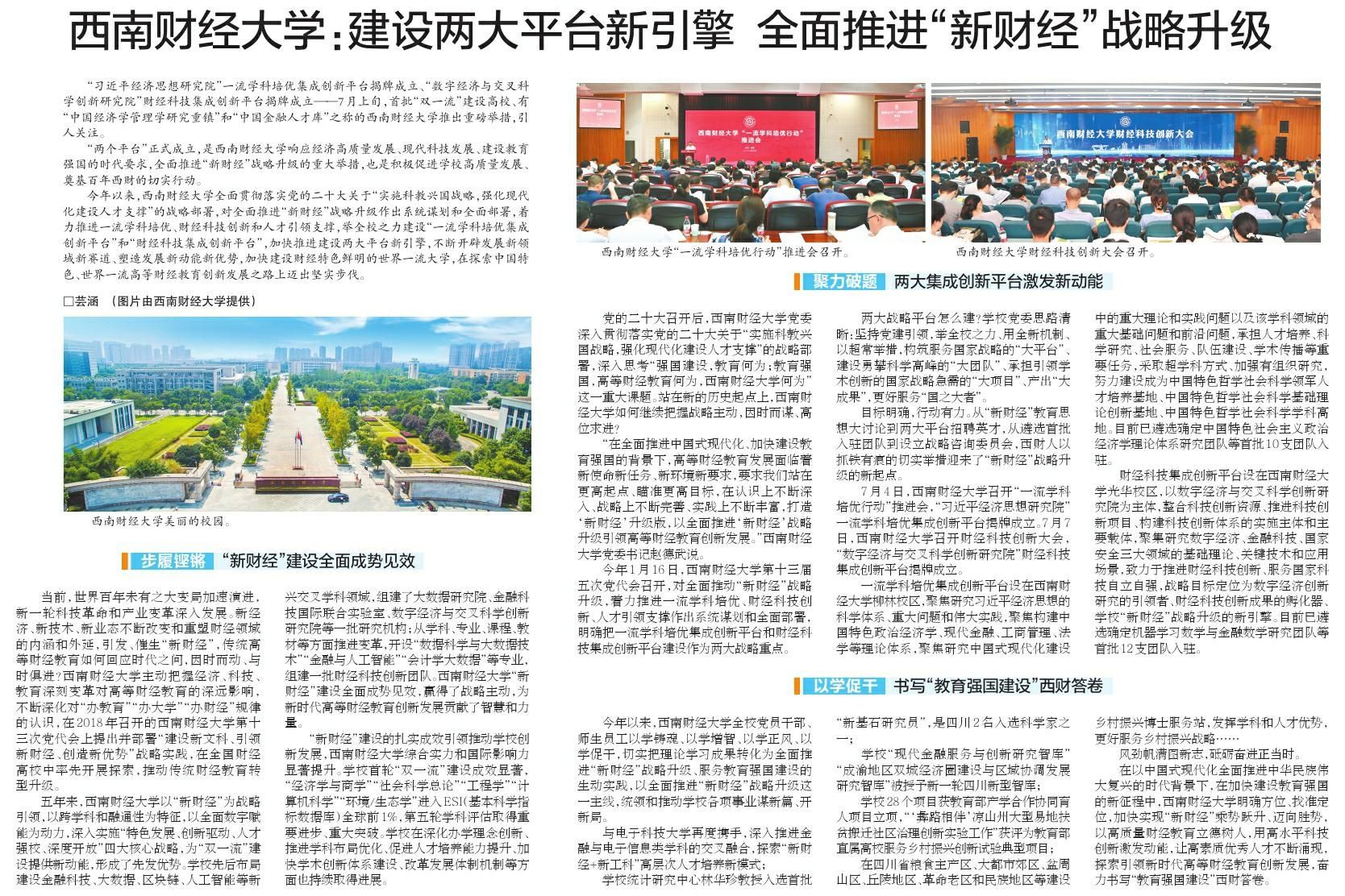 深入贯彻党的二十大关于教育、科技、人才一体推进的战略部署,认真落实学校十三届五次党代会精神和会议《决定》,立足“新财经”建设先发优势,把全面推进“新财经”战略升级作为新时代学校发展的战略方向,着力推动一流学科培优、财经科技创新和人才引领支撑“三大行动”。召开“一流学科培优行动”推进大会和财经科技创新大会,成立“习近平经济思想研究院”一流学科集成创新平台和“数字经济与交叉科学创新研究院”财经科技集成创新平台,遴选22支团队入驻,加快建设中国特色哲学社会科学高地、财经科技创新高地、国家及西部一流财经人才高地“三大高地”。扎实推进“十四五”发展规划和第二轮“双一流”建设方案落地落实,持续优化学科专业(领域)战略布局,深入推进“马克思主义理论学科领航计划,经管学科引领计划,理工学科攀登计划,法文学科繁荣计划,新兴交叉学科建设计划”五大学科建设计划,在推动建构中国自主知识体系、提升人才自主培养能力、服务国家重大战略需求、支撑国家科技自立自强等方面取得重要标志性成果,学校核心竞争力、社会贡献度和国际影响力显著增强,专家组在第二轮“双一流”建设中期评估中对学校给予充分肯定。“环境/生态学”和“数学”相继成为学校第五、第六个ESI全球前1%学科,“经济学与商学”在US NEWS世界大学排名位列中国大陆第3、财经高校第1,11个学科跻身四川省“双一流”建设“贡嘎计划建设学科”。
