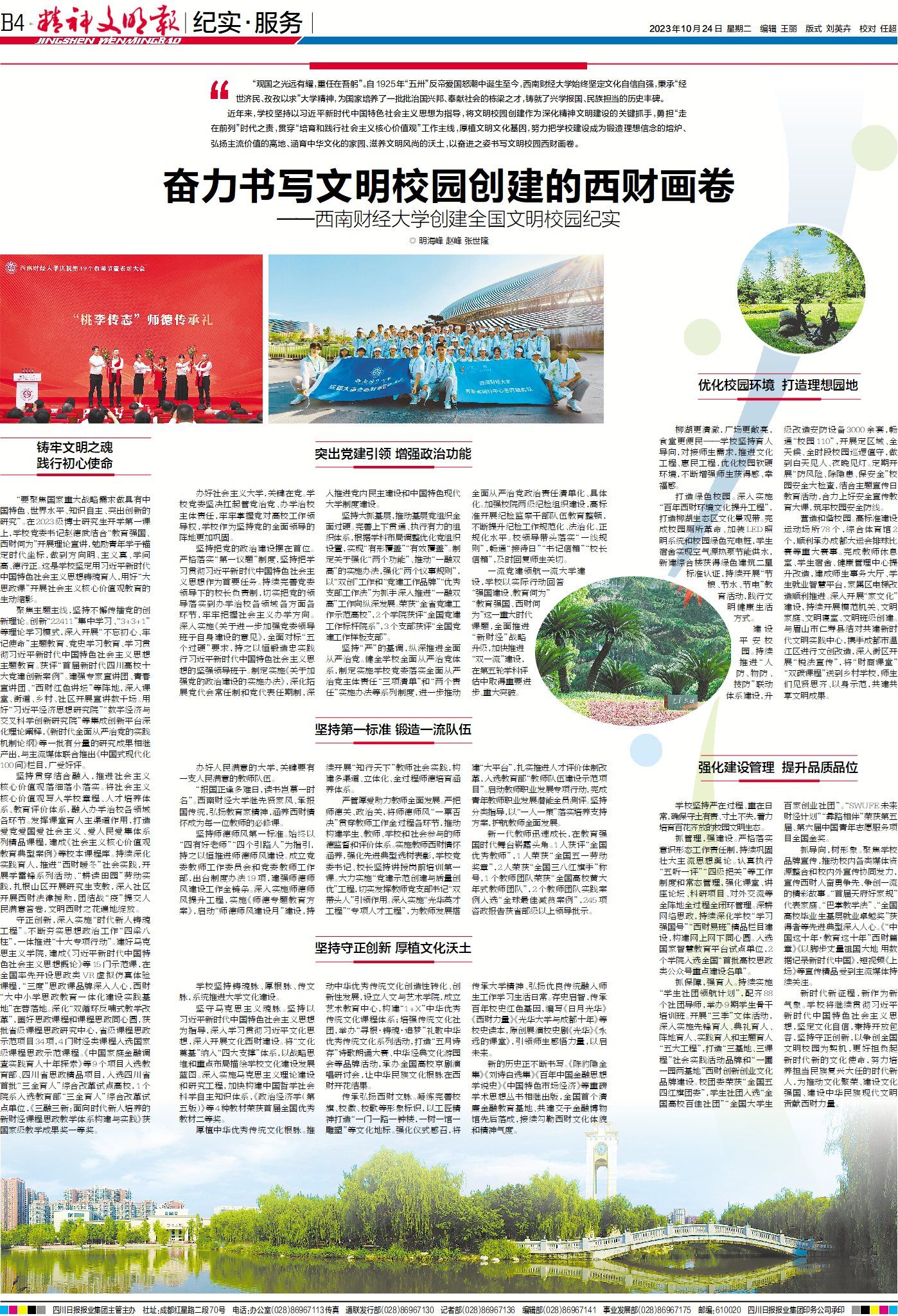 学校党委坚决扛牢管党治党政治责任,切实强化党的建设,持续提升思想政治工作质量。创新设置“一流学科培优”“财经科技创新”两大集成创新平台党组织,高质量推进全省示范高校验收工作,立项党建创新项目54项,遴选发布第二批“党建工作品牌”5个和“优秀支部工作法”10个,获评全省高校党建工作标杆院系、样板支部、“双带头人”工作室、研究生样板支部各1个。开展科级干部选任工作。扎实开展统战工作,获评“四川省统战工作先进集体”,入选全省高校统战工作品牌。深入推进纪检监察监督、巡察监督、审计监督、财会监督贯通协同高效,1个案例在高校廉洁教育活动中获评优秀。扎实做好第六轮巡察,高质量实现巡察五年全覆盖,召开总结大会对深化政治巡察进行全面总结部署。全面实施“时代新人铸魂工程”,一体推进“十大专项行动”,持续推进习近平新时代中国特色社会主义思想和党的二十大精神“三进”工作,圆满完成全省“三全育人”综合改革第一批试点总结和第二批中期评估,获评教育部学习型社会建设重点项目1项、高校学生心理健康教育指导典型案例1项,获四川省第三批“三全育人”综合改革试点院(系)1个,3个育人项目获评四川省高校思想政治工作精品项目,5人荣获四川省思政工作“年度人物”嘉奖,2个案例入选第一批“三全育人”综合改革试点高校优秀典型案例,获批四川省大中小学思政课一体化共同体。