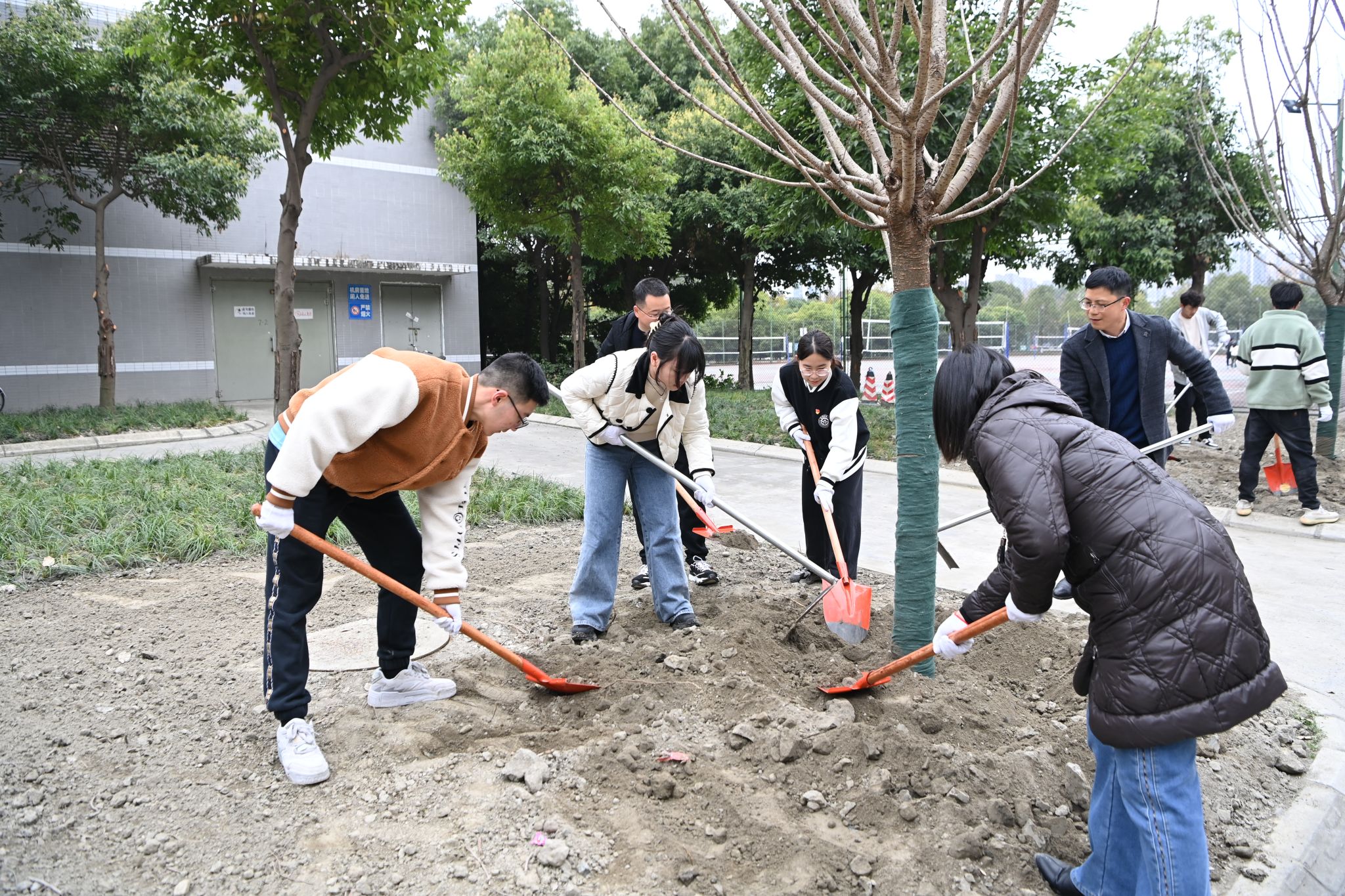 下午两点,植树护树活动在两校区同时举行。柳林校区诗白书院南侧,师生们三五人一组,团结协作干劲十足,挥舞铁锹、铲土挖坑、踏土夯实、覆土平整……劳动现场有条不紊,各个环节衔接有序。经过师生近一个小时的辛勤劳作,88株重瓣晚樱迎风而立,为美丽校园增添了一道生机盎然的风景线。光华校区光华楼西侧草坪,师生们撸起袖子拎起水桶,认真细致地为每一株树木施肥浇水,一株株银杏、杜英、玉兰在和煦春风中享受涓涓清流的浇灌,焕发出勃勃生机。