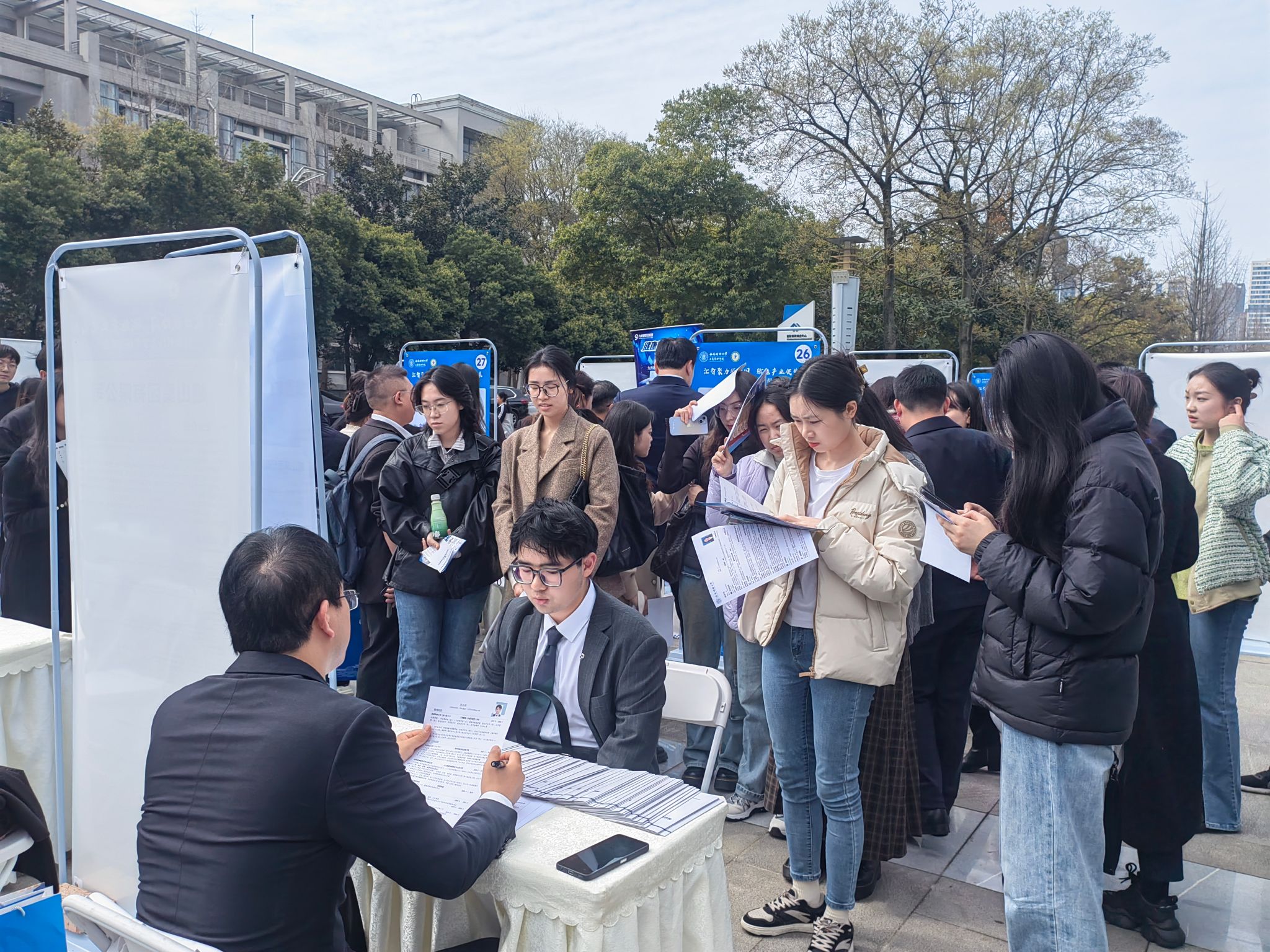 发布仪式后,校企供需洽谈对接会及“2024年春季工商学科毕业生专场招聘会”在弘远楼举行。此次招聘会共有60家企事业单位提供1100多个就业和实习岗位,涵盖党政机关、高等院校、金融机构、商务服务等领域。现场还设立了职业指导区,一对一进行简历修改、面试指导等服务。现场气氛热烈,同学们积极投递简历并有序面试。