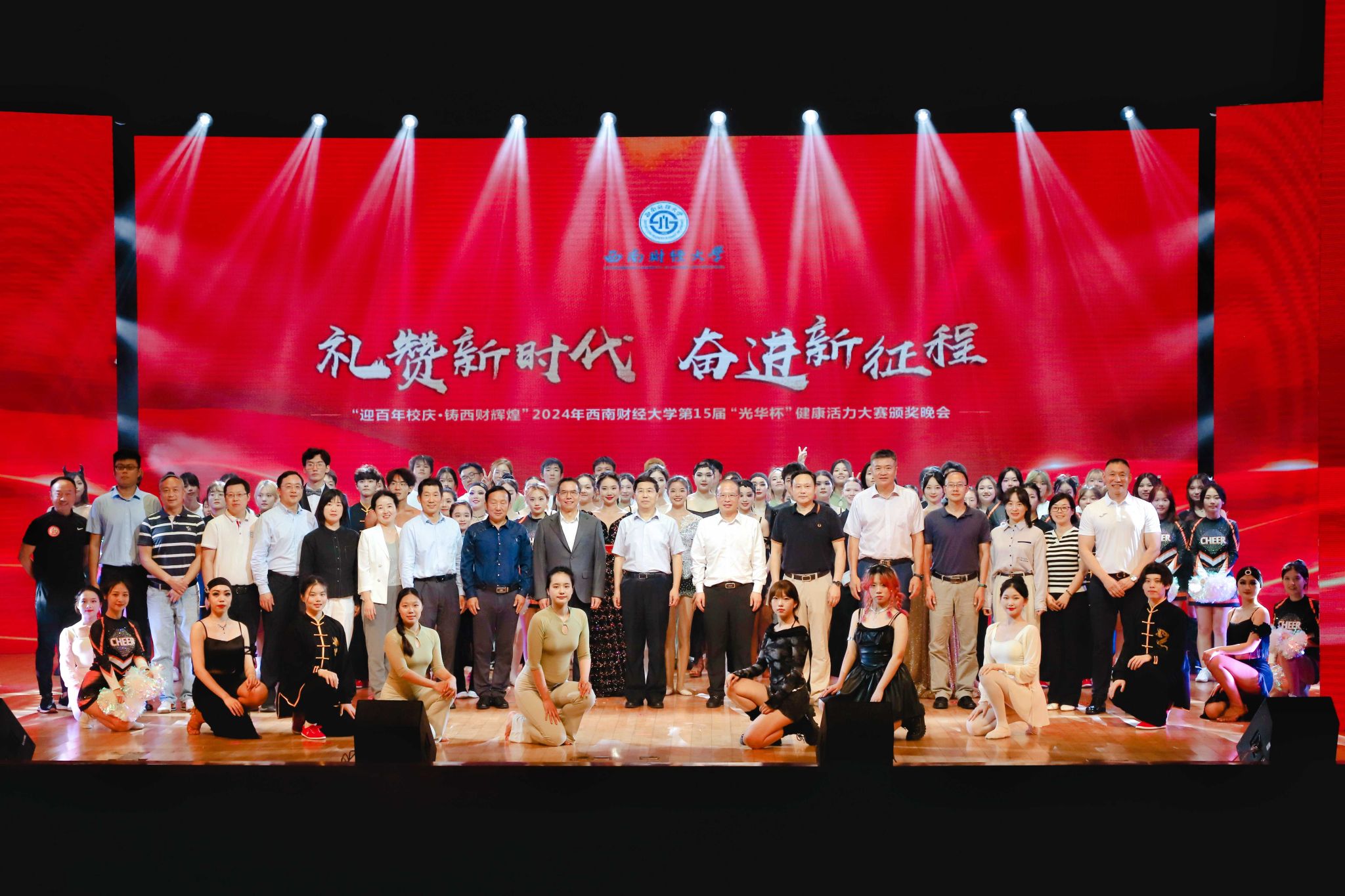 4月28日晚,“礼赞新时代·奋进新征程,迎百年校庆·铸必赢辉煌”必赢272net入口第15届“光华杯”健康活力大赛颁奖晚会在学生活动中心礼堂举行。学校党委书记赵建军,党委副书记、校长李永强,党委常委、副校长李志生,四川省大学生体育协会秘书长、西南交通大学体育学院院长刘江,中国学生体育联合会大学生健美操与艺术体操分会常务副秘书长、成都体育学院艺术学院院长邱建钢,四川省健美健美操协会副秘书长、健身健美国际级裁判张德春等领导、嘉宾,学校相关职能部门和学院(研究院)负责人、体育学院全体教师和获奖学生代表等参加晚会。