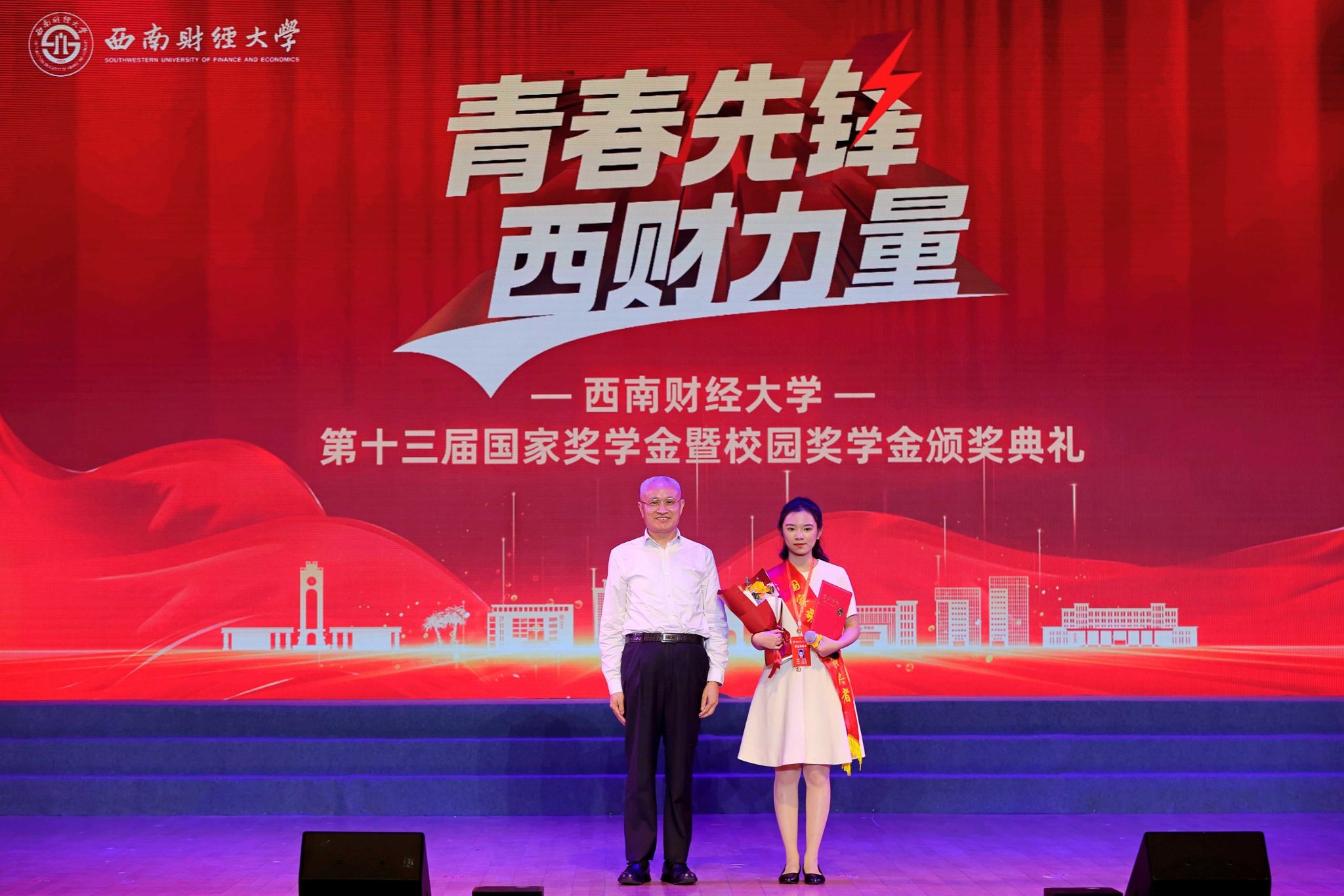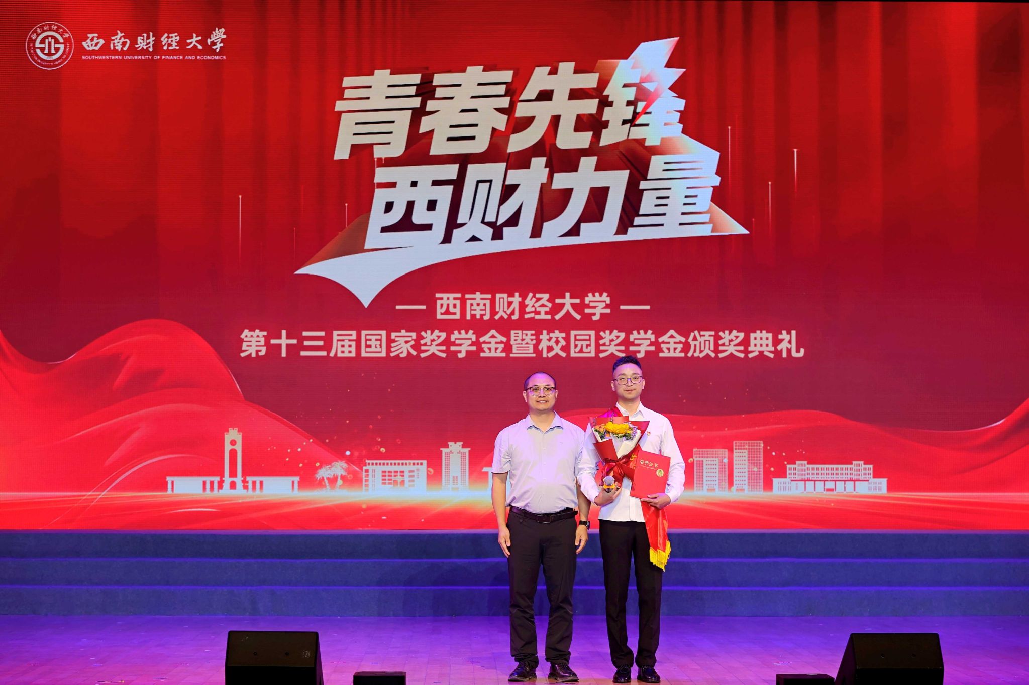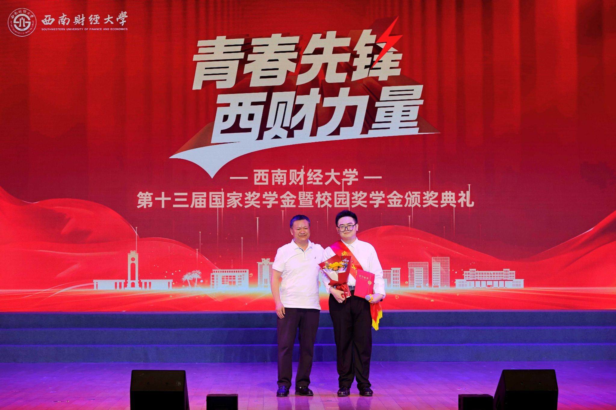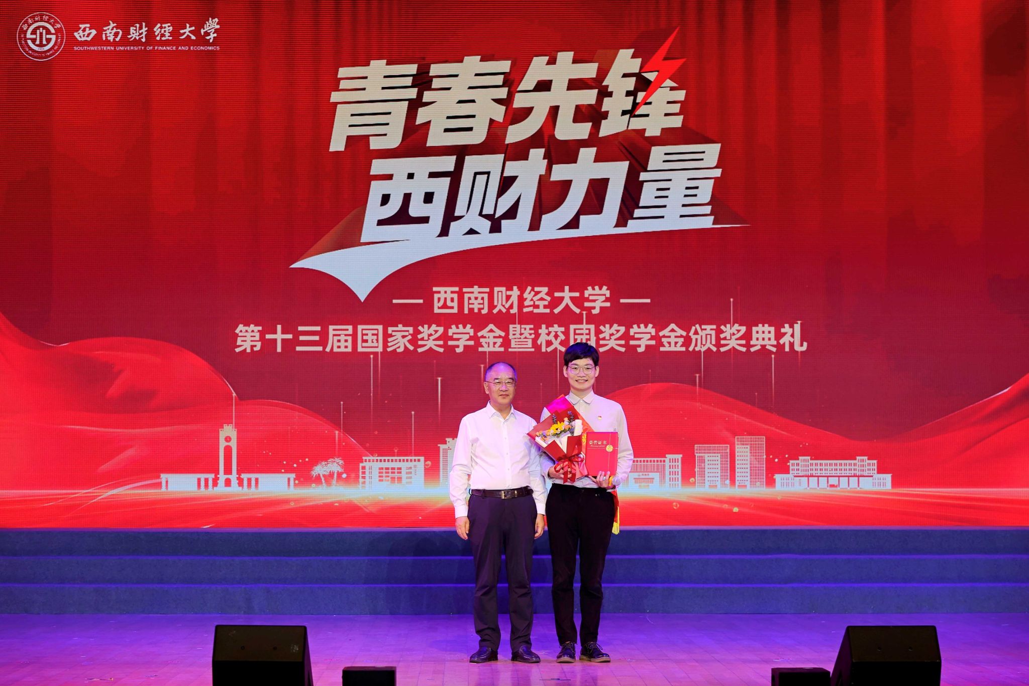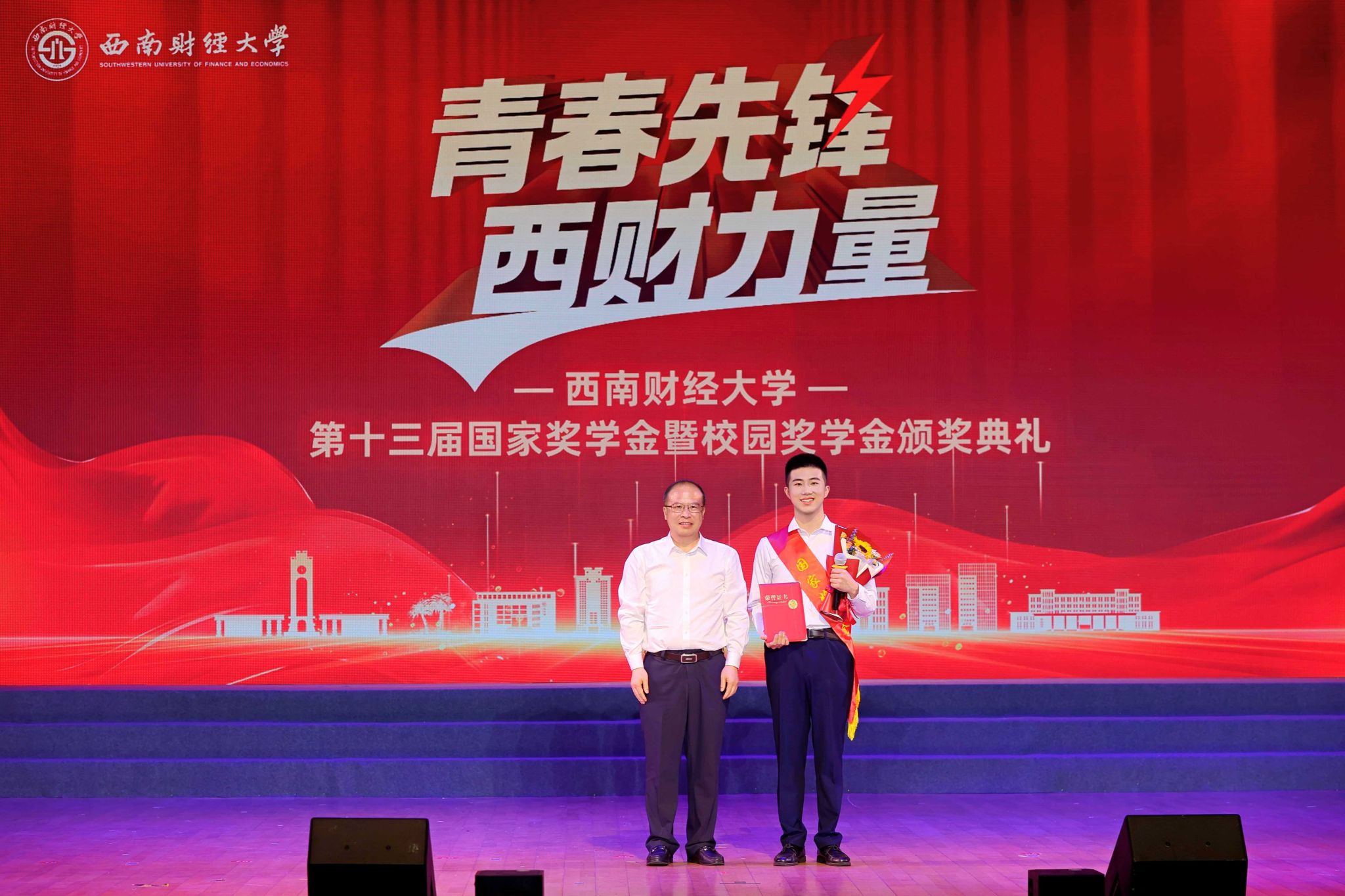 熠熠青春逢盛世,莘莘学子灼其华。5月15日晚,学校第十三届国家奖学金暨校园奖学金颁奖典礼在柳林校区学生活动中心举行。学校党委书记赵建军,党委副书记、校长李永强,党委常委、副校长史代敏,党委原副书记、学校关心下一代工作委员会副主任曾道荣,成都铸信企业(集团)有限公司董事长曾永江出席典礼,获奖同学、颁奖嘉宾及各职能部门和学院(研究院)负责人、辅导员、学生代表等800余人参加典礼。