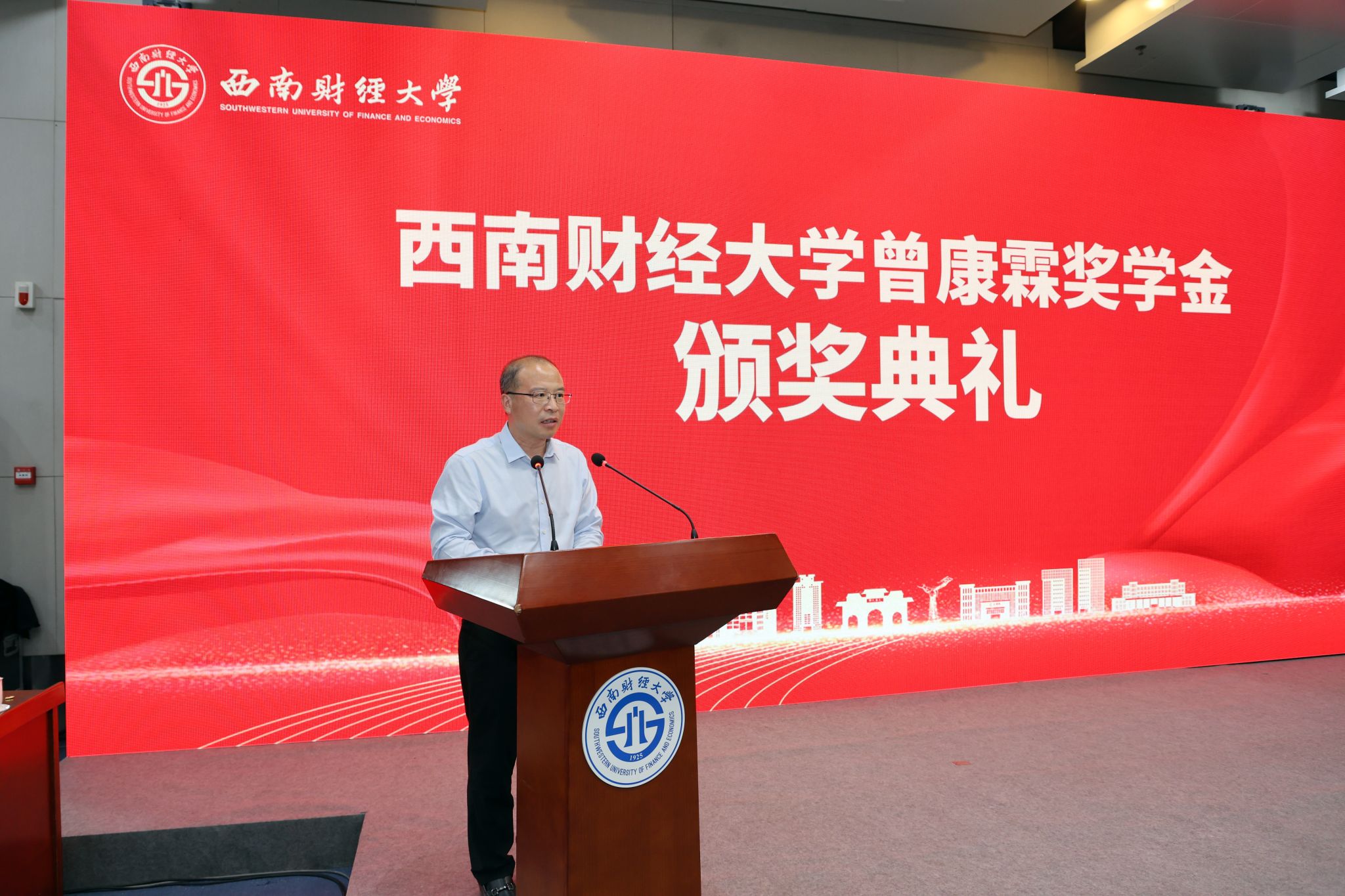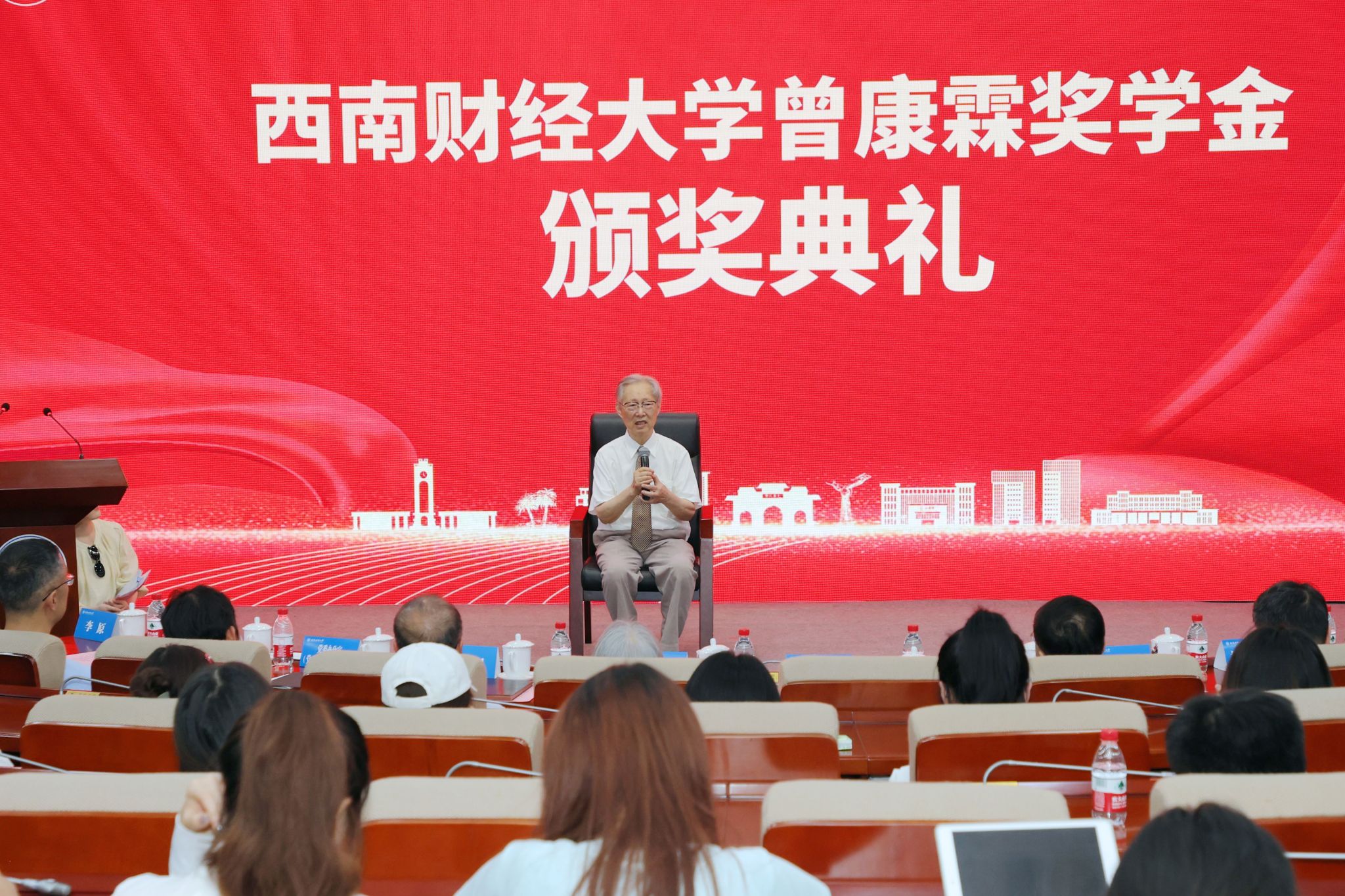 李永强在致辞中代表学校向曾康霖教授及家人表示诚挚感谢和崇高敬意。他表示,曾康霖教授数十载如一日,始终秉持对教育事业的忠诚与奉献,对金融学科的执着与追求,潜心育才、深耕学术,为我国金融学科建设与发展倾注了巨大心血,培养了一大批优秀金融人才,为国家金融事业和金融教育事业发展作出了卓著贡献。他勉励全校师生仰先生之大德,心怀大我,赤诚报国;慕先生之大学,开放包容,格致穷理;循先生之大道,知行合一,笃行不怠。他希望同学们心怀“国之大者”,弘扬必赢精神,从深沉的文化自信和时代责任中汲取求知、明理、增智的不竭动力,争做有理想、敢担当、能吃苦、肯奋斗的新时代好青年,奋力书写为中国式现代化挺膺担当的青春篇章。