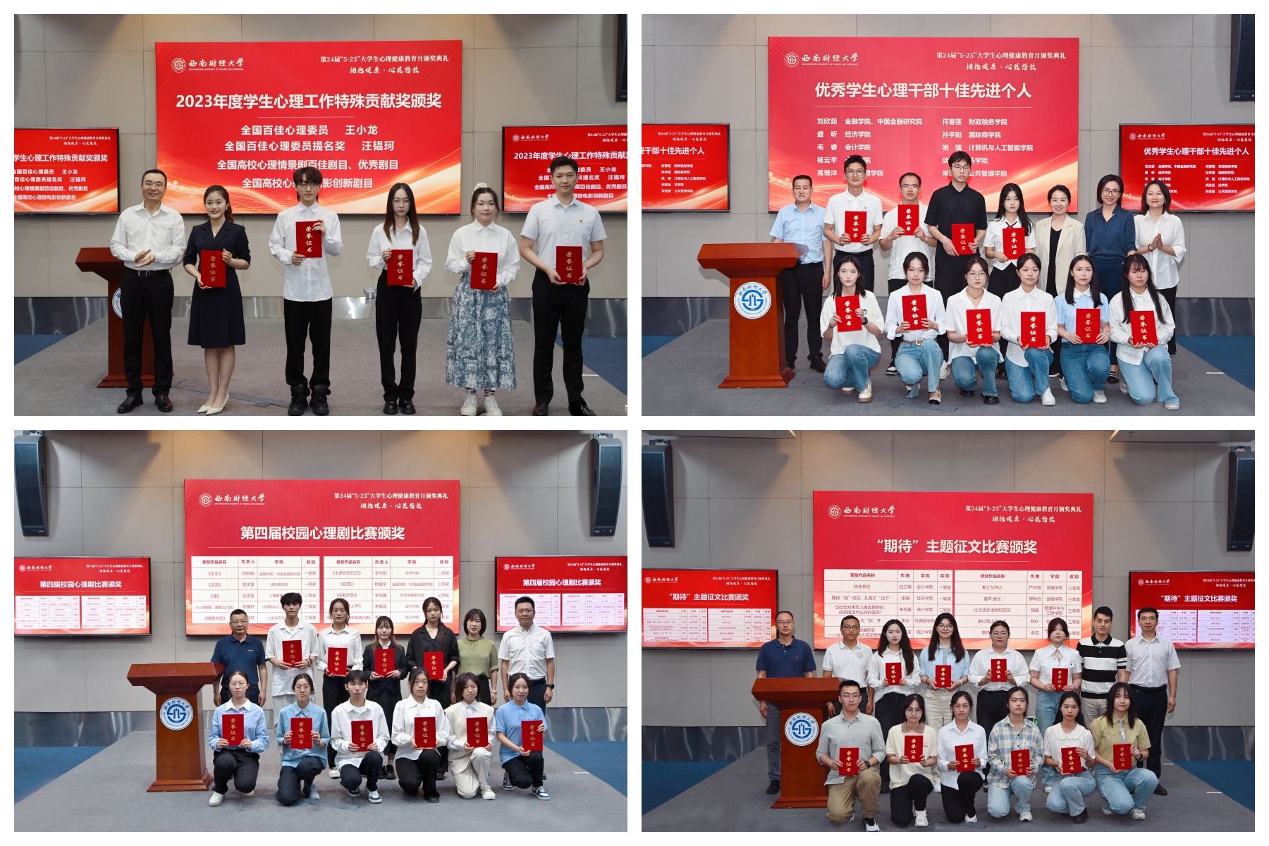 典礼集中展示了心理健康教育月活动开展情况、优秀集体和个人先进事迹,为主题征文比赛和校园心理剧比赛获奖队伍、优秀学生心理干部十佳先进个人、学生心理工作特殊贡献奖获奖者颁奖。会计学院学生工作负责人代表首批学院(研究院)心理工作示范站作交流发言,国际商学院本科生孙宇阳代表优秀学生心理干部作交流发言。