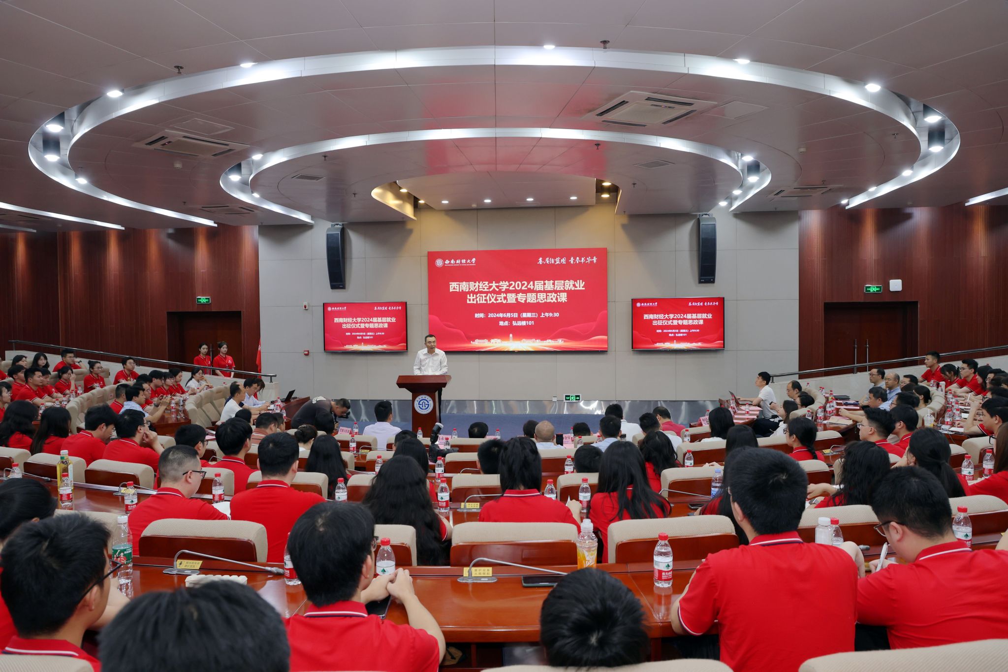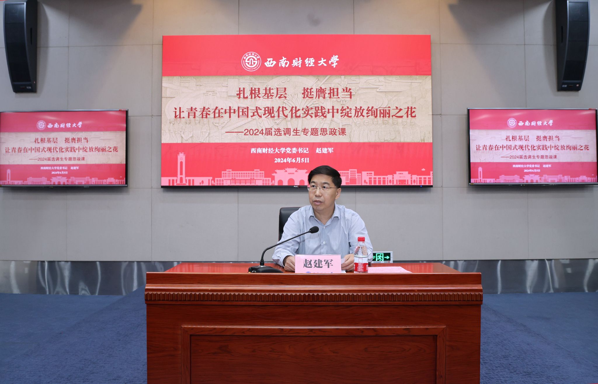 6月5日上午,学校2024届毕业生基层就业出征仪式暨专题思政课在弘远楼101会议室举行。党委书记赵建军参加仪式并讲专题思政课,党委常委、副校长马永强主持仪式,四川省委组织部干部队伍建设规划办副主任、二级调研员王小佳,学校相关职能部门、各学院(研究院)负责人,选调生校友代表和2024届选调生参加活动。