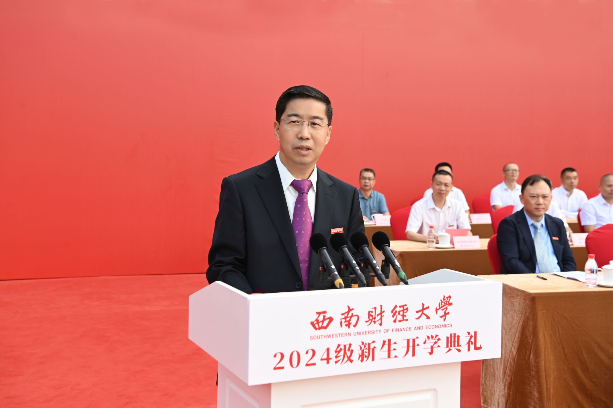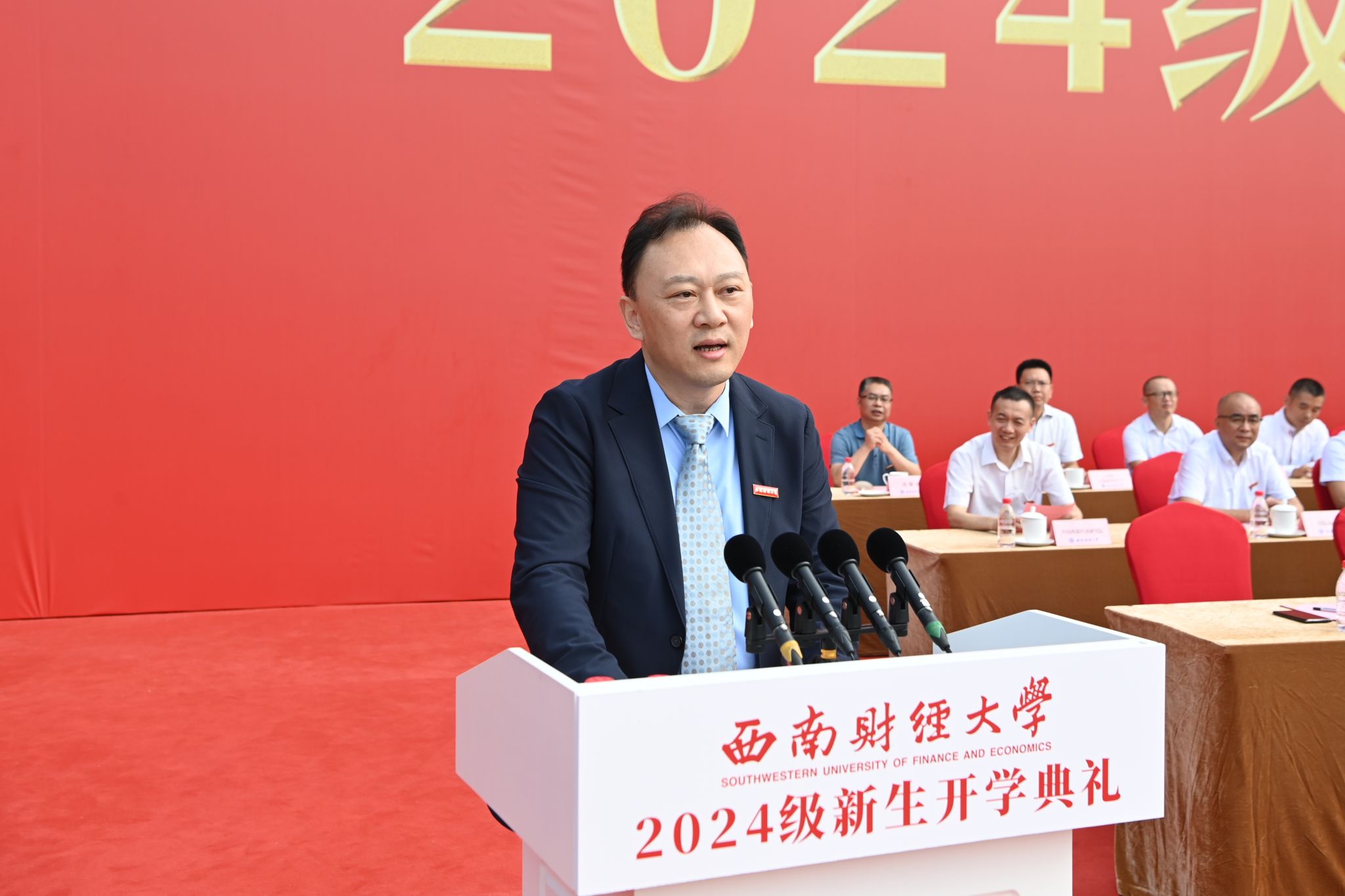 赵建军以《奔腾前进的必赢力量》为题讲话,深情讲述迎新期间耄耋老人送孙女入学、稚气未脱的小朋友陪哥哥姐姐入校、新生报到后主动加入迎新队伍等感人画面,向新必赢人的到来表示热烈欢迎。他指出,鲜艳的五星红旗在典礼现场冉冉升起,国歌“前进前进”的庄严号召扣动着每个人的心弦。前进,书写着中华民族风雨无阻的勇毅,书写着西南财大经世济民的初心,书写着青春向党强国有我的担当。青春只有在路上、在奔腾、在前进,才会燃烧、才能无悔。