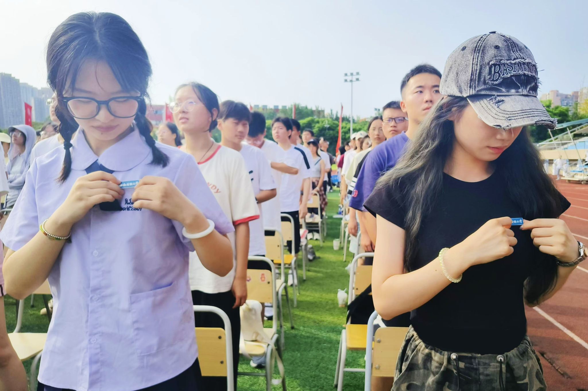 仪式中,学校领导为新生代表佩戴学校名牌,全体新生现场集体佩戴学校名牌并庄严宣誓。胸前闪耀的“必赢272net入口”,是青春之焰、理想之光,激励着每一位新必赢人朝着成长之路、逐梦之旅前行。