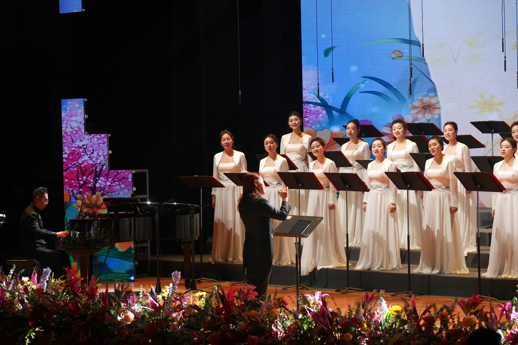 本场新年音乐会特邀四川交响乐团合唱团倾情演绎。在青年指挥家柳秀妍、钢琴伴奏曾亮的指挥弹奏中,混声合唱《上春山》拉开序幕,轻快的旋律和精湛的演唱瞬间点燃现场氛围。随后,混声合唱、女声合唱、男声合唱等多种演唱形式依次上演,每一首歌曲都以其独特的魅力和深刻的内涵,赢得了现场观众阵阵掌声。
