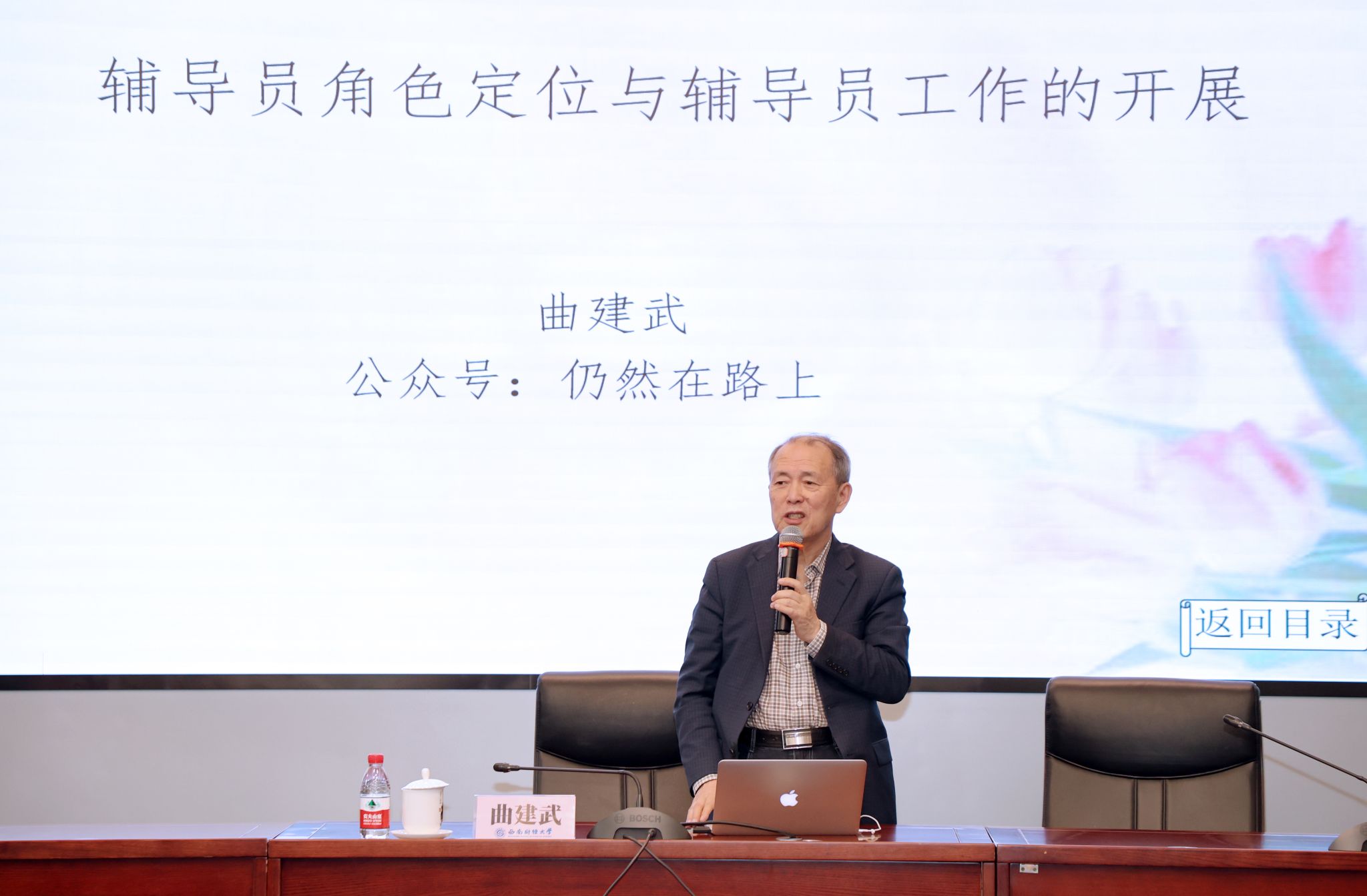 曲建武教授以《辅导员角色定位与辅导员工作的开展》为题,结合四十余载育人经历和师者仁心大爱,从“文化视角、政治视角、人民满意视角、学生成长视角”四个维度诠释了辅导员的角色定位,从“坚定理想信念、加强自身学习、脚踏实地工作、淡泊名利、以情感人”多个角度讲述了辅导员如何认清角色定位,并就辅导员职业道路选择与坚守勉励辅导员不仅要引导学生做好人生规划,更要规划好自己的人生道路。讲座上,一张张记录温馨瞬间的照片、一封封饱含深情的信件、一段段充满智慧的育人故事,都展现了一名高校学生思想政治教育工作者“为党育人、为国育才”的赤诚之心,以及“在讲坛践行使命,用情怀抒写担当”的惓惓之忱。与会辅导员表示倍受鼓舞,将以曲建武教授为榜样,在今后工作中时刻牢记立德树人根本任务,履行好育人使命,真正做到关心关爱学生,将榜样经验融入日常工作,引导学生立报国强国大志向,做挺膺担当奋斗者。