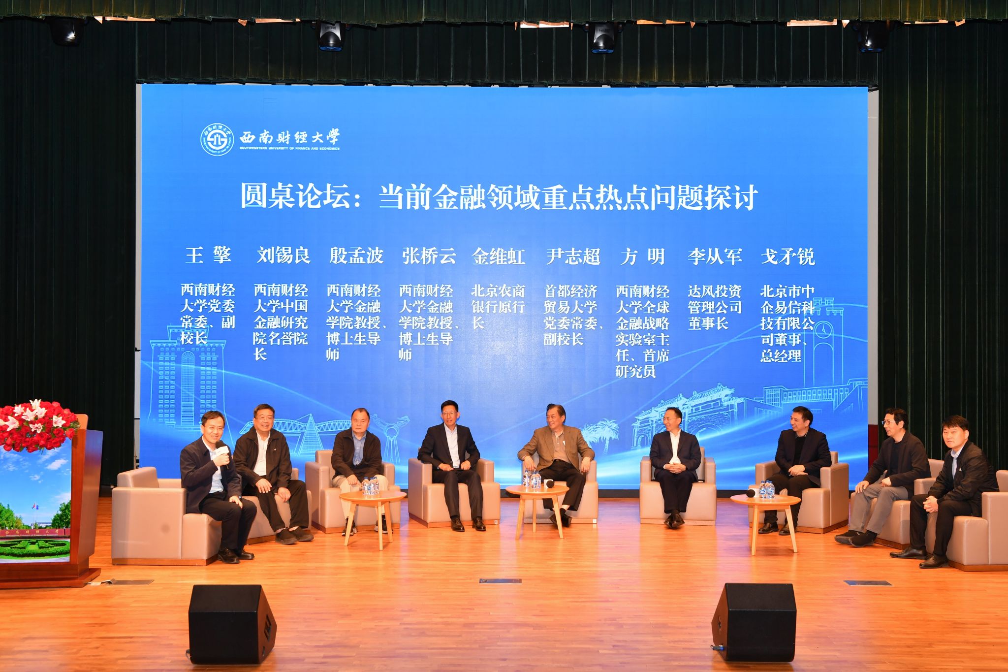 圆桌论坛中,学校中国金融研究院名誉院长刘锡良,金融学院、中国金融研究院教授殷孟波、张桥云,北京农商银行原行长金维虹,首都经济贸易大学党委常委、副校长尹志超,学校全球金融战略实验室主任、首席研究员方明,达风投资管理公司董事长李从军,北京市中企易信科技有限公司董事、总经理戈矛锐围绕当前金融领域重点热点问题展开研讨。