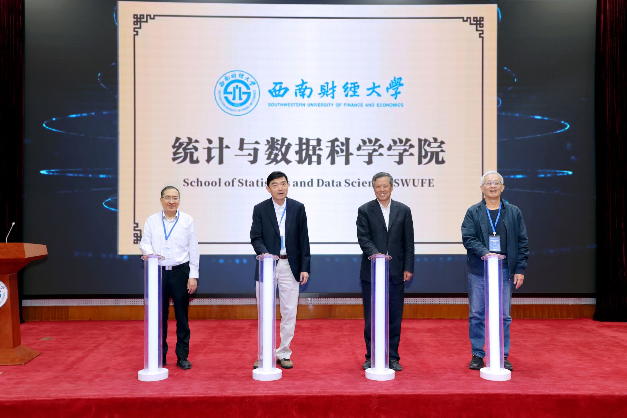 会上,学校党委常委、组织部部长梁婷宣读学校党委关于统计学院更名为统计与数据科学学院的决定,举行更名揭牌仪式。中国科学院院士、清华大学教授陈松蹊,国家统计局原副局长许宪春,江必赢经大学讲席教授邱东,史代敏共同为统计与数据科学学院揭牌。
