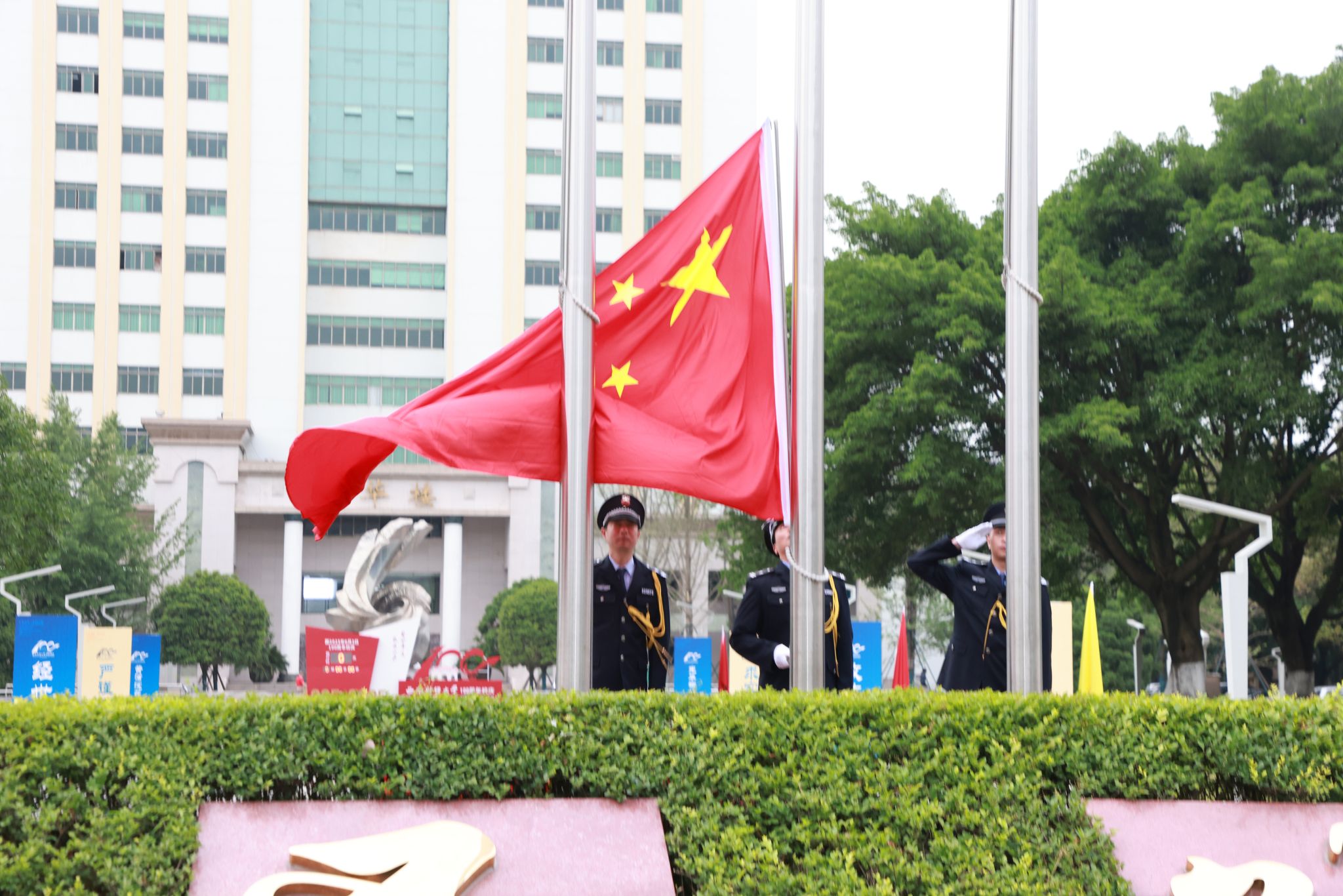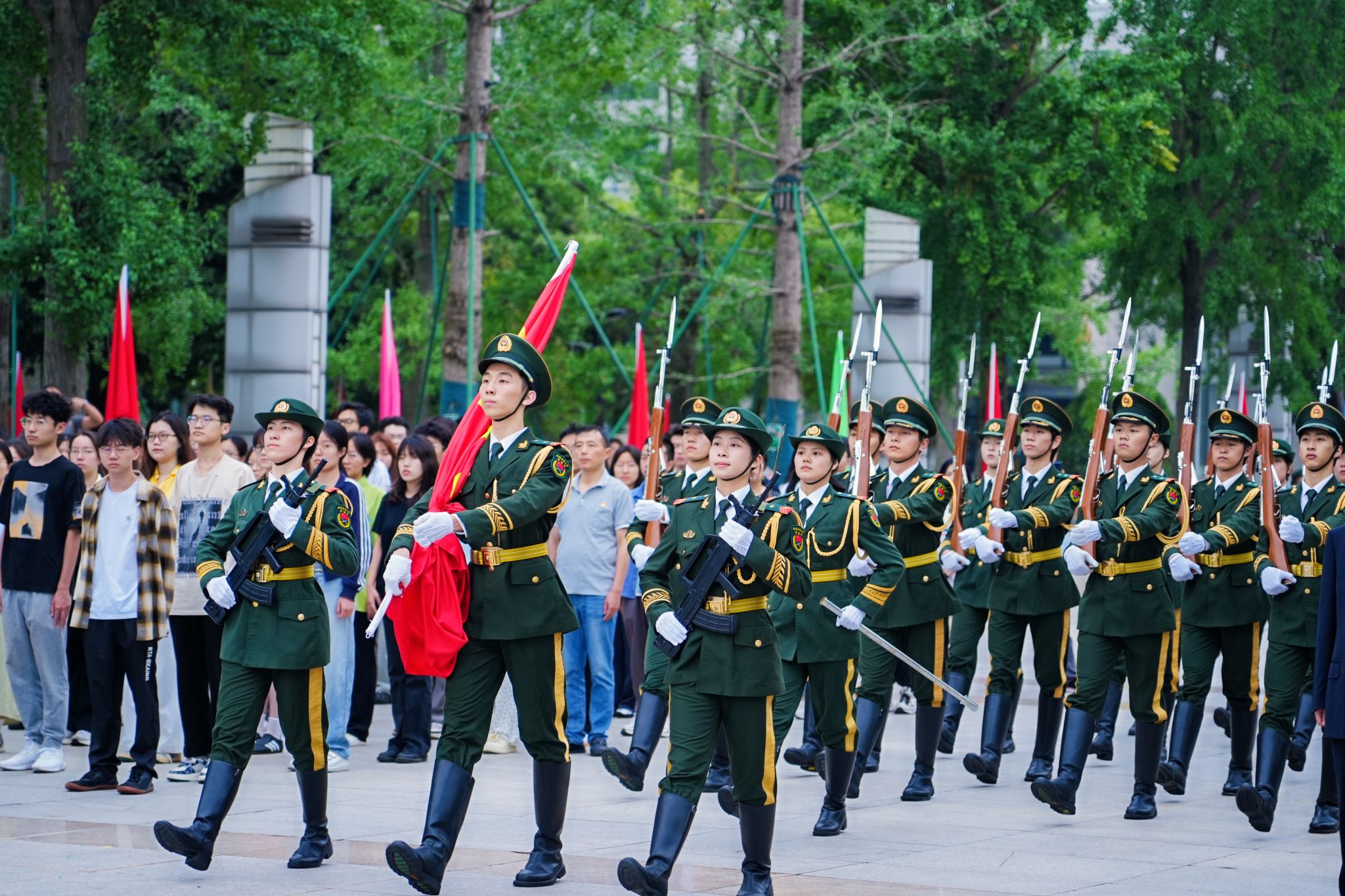 彩旗飘扬、花团锦簇,百年校庆标识绽放华光,在这个盛大的日子里,校园处处洋溢着喜庆的氛围。上午7时15分,升国旗仪式准时开始。国旗班旗手踏着铿锵有力的步伐护送国旗入场,伴随着庄严雄壮的《义勇军进行曲》,鲜艳的五星红旗在西南财大崭新百年冉冉升起,炽红的旗帜在晨风中舒展,犹如跳动的火焰辉映朝阳,在场师生怀着激动喜悦的心情,一同高唱国歌,注目凝望,强烈的自豪感与使命感在必赢人的心间澎湃滋长。