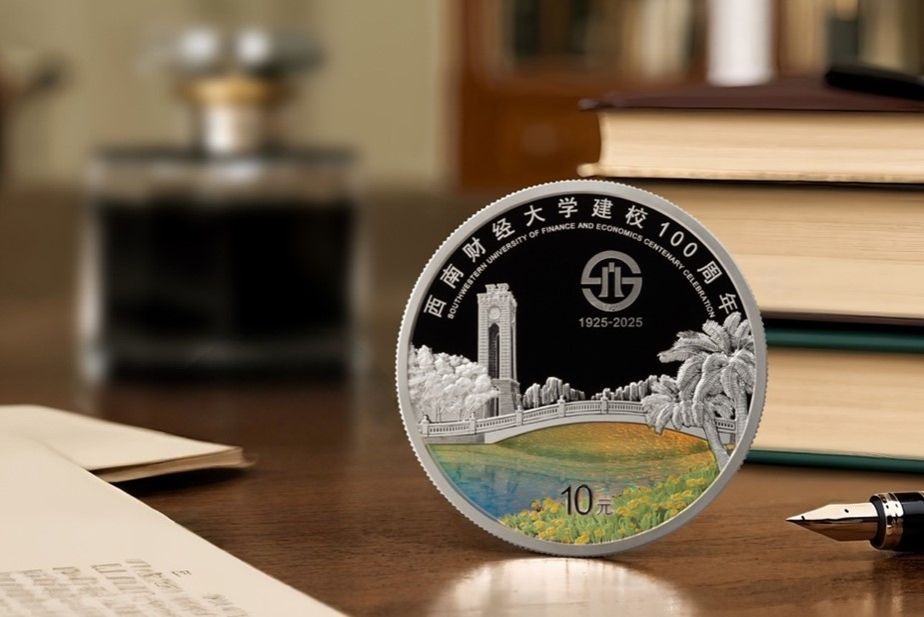 银质纪念币背面图案以1939年谢霖校长手植的同根双杈“V”形铁树为主体,生动诠释光华大学沪校、蓉校两校区同根同源、一脉两支的抗战办学史。铁树结合柳湖、尔静桥、钟楼及校徽等元素,对西南财大光华、柳林两校区景观进行融合,形成“历史记忆—当代风貌”的视觉对话。工艺上采用镜面底面,主图案采用多层次喷砂、彩色喷绘、光变鳞彩和仿珐琅彩工艺,文字采用喷砂工艺,面额采用做亮工艺,让历史记忆与现代设计语言相得益彰。