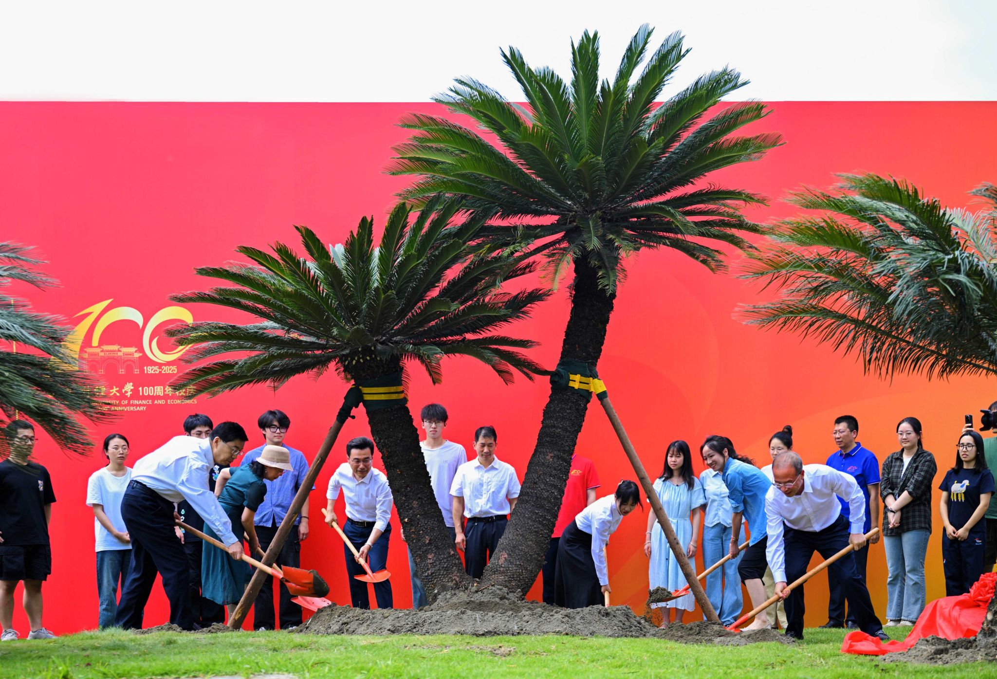 铁树下赵建军即席讲话,分享了刘诗白校长题名柳林铁树的深意,代表学校向老先生致以崇高敬意。他指出,栽种柳林铁树是一份对历史的传承,86年前谢霖先生在光华校区亲手种下一株“V”形铁树,祈愿抗战胜利。从光华到柳林,两棵铁树跨越时空,共同守护历史根脉、传承必赢精神、筑梦美好未来。这是一份对大师的崇敬,光华铁树由谢霖先生亲手种下、柳林铁树由刘诗白校长亲自提笔命名,寓意必赢学脉绵延、师道传承。这是一份对未来的期许,刘诗白校长特意委派亲属代表与师生一起种下这株铁树,饱含着全体必赢人对新百年的憧憬,激励着必赢人勇往直前,创造更加美好的未来。最后,赵建军勉励师生们凝心聚力、团结奋进,在中国式现代化的伟大征程上跑出属于新一代必赢人的加速度、好成绩。