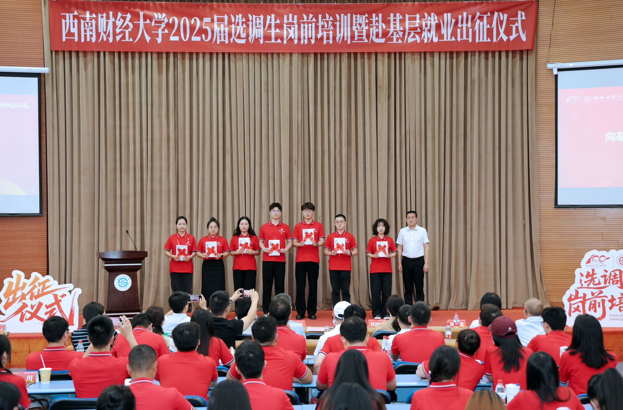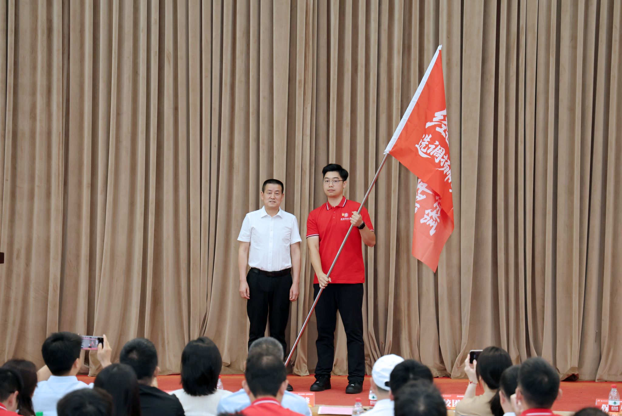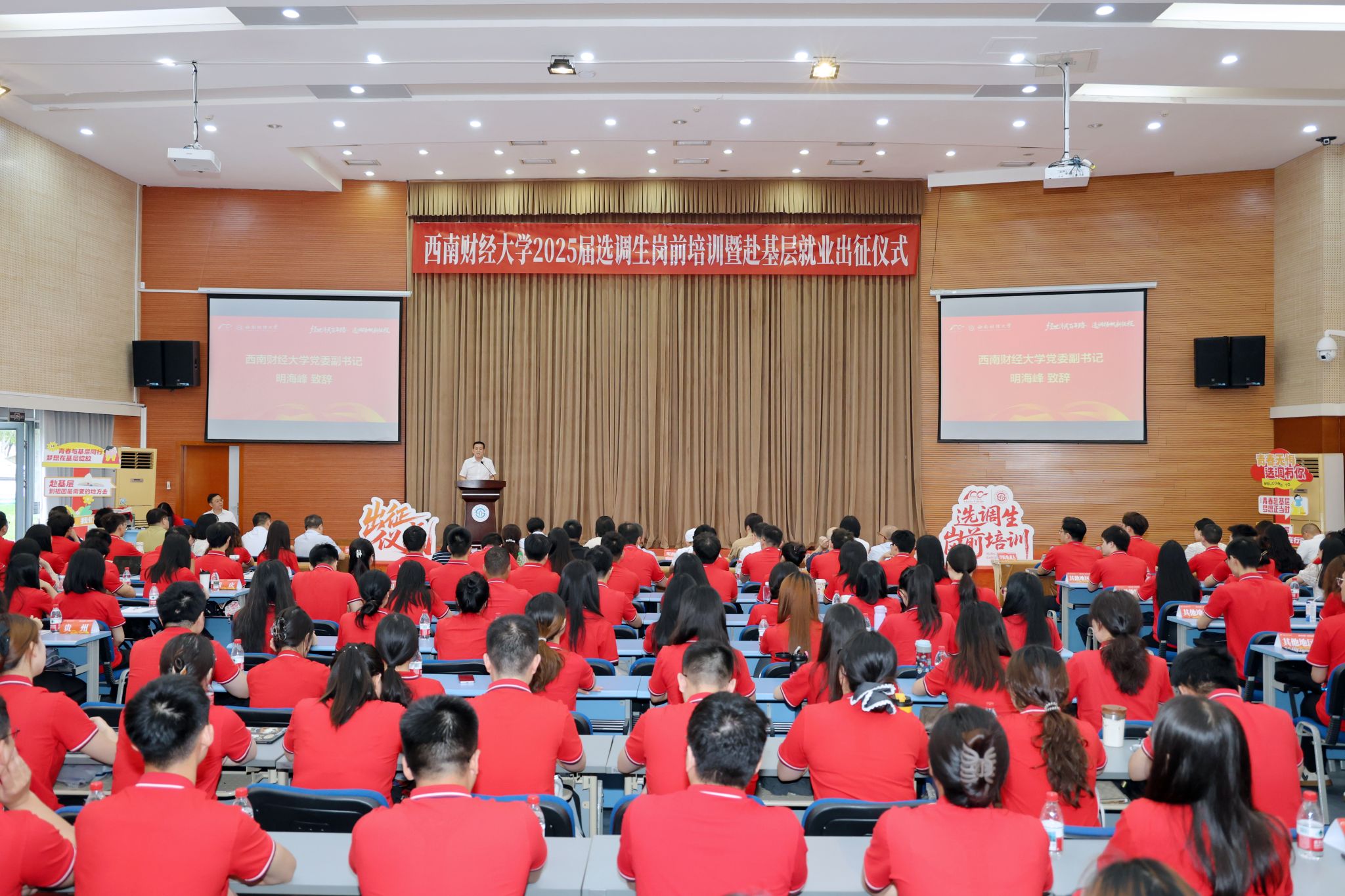 出征仪式上,明海峰向选调生代表授旗,为选调生代表赠送书籍,勉励广大学子既要永葆“扛旗出征”的使命担当,又要锤炼“提笔能写”的专业素养,以实际行动诠释必赢精神。