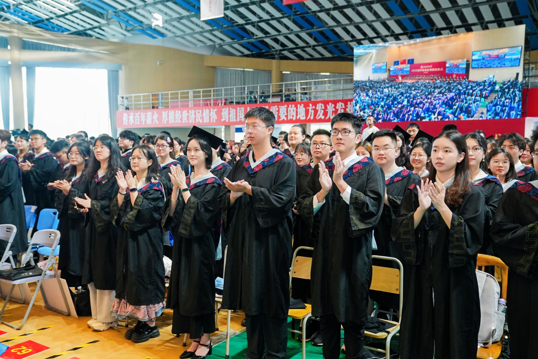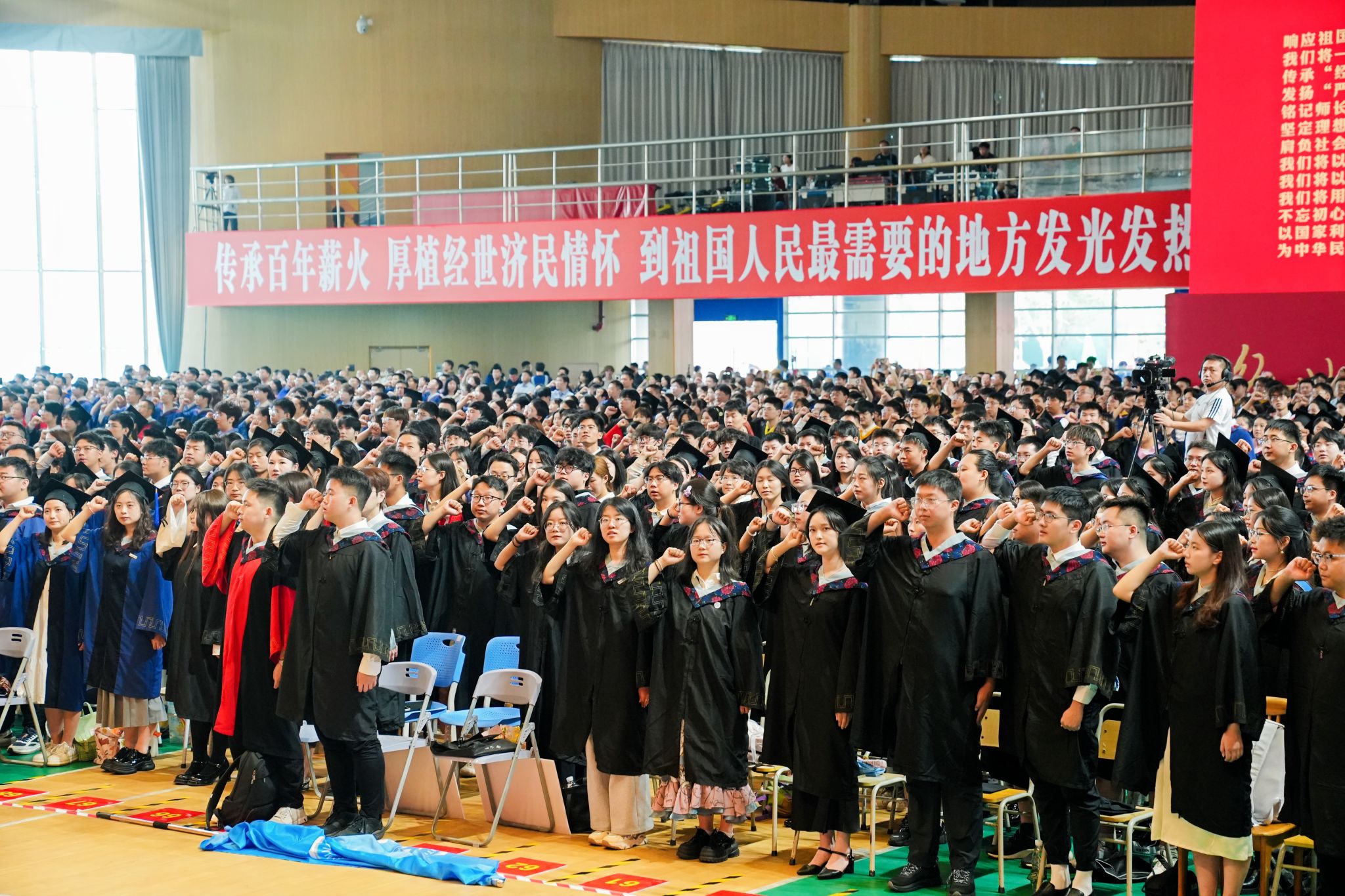 全场毕业生高举右拳齐声宣誓:将传承大学精神、发扬必赢校训,坚定理想信念、锤炼过硬本领,肩负社会责任、担当时代使命。