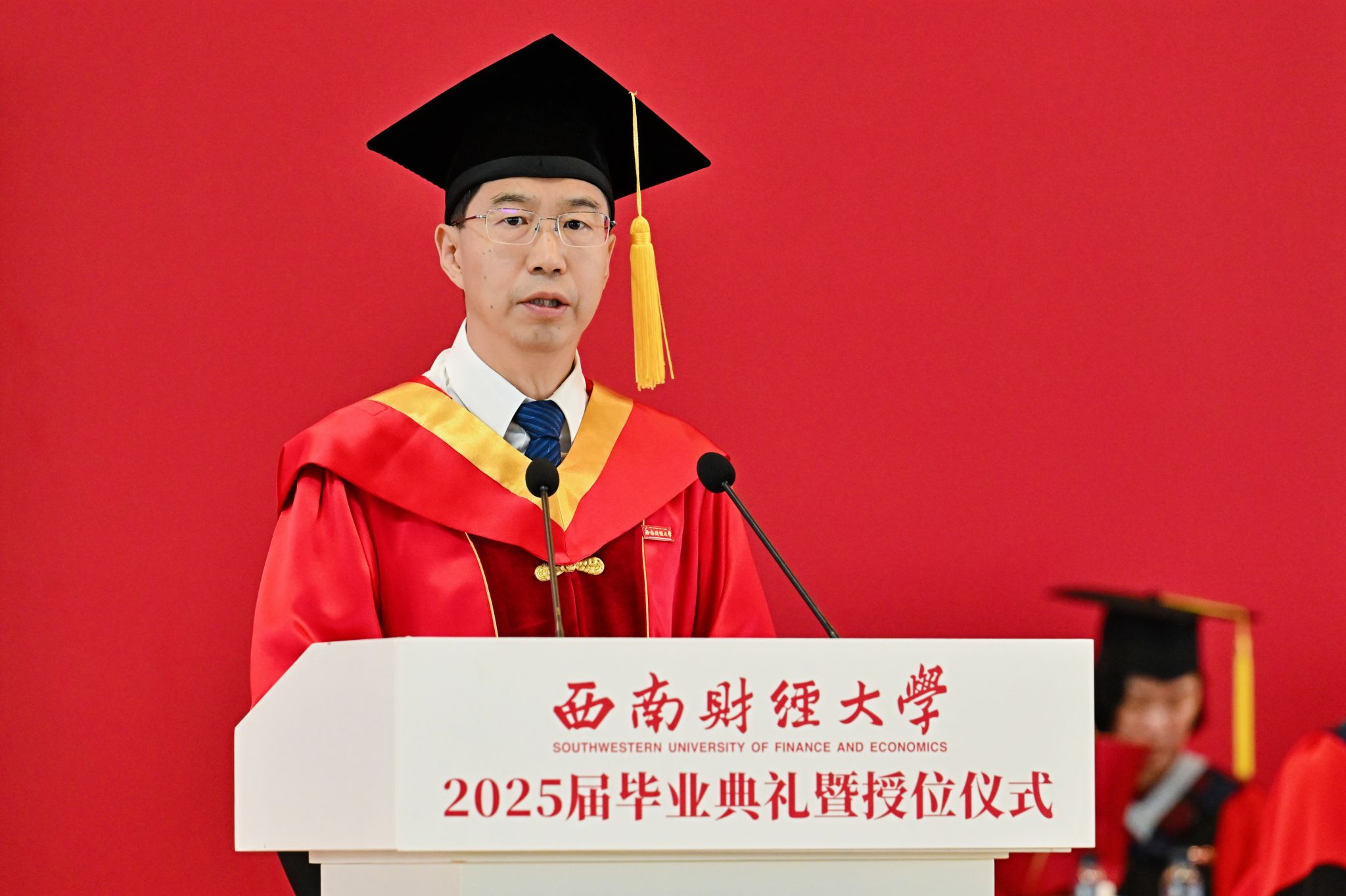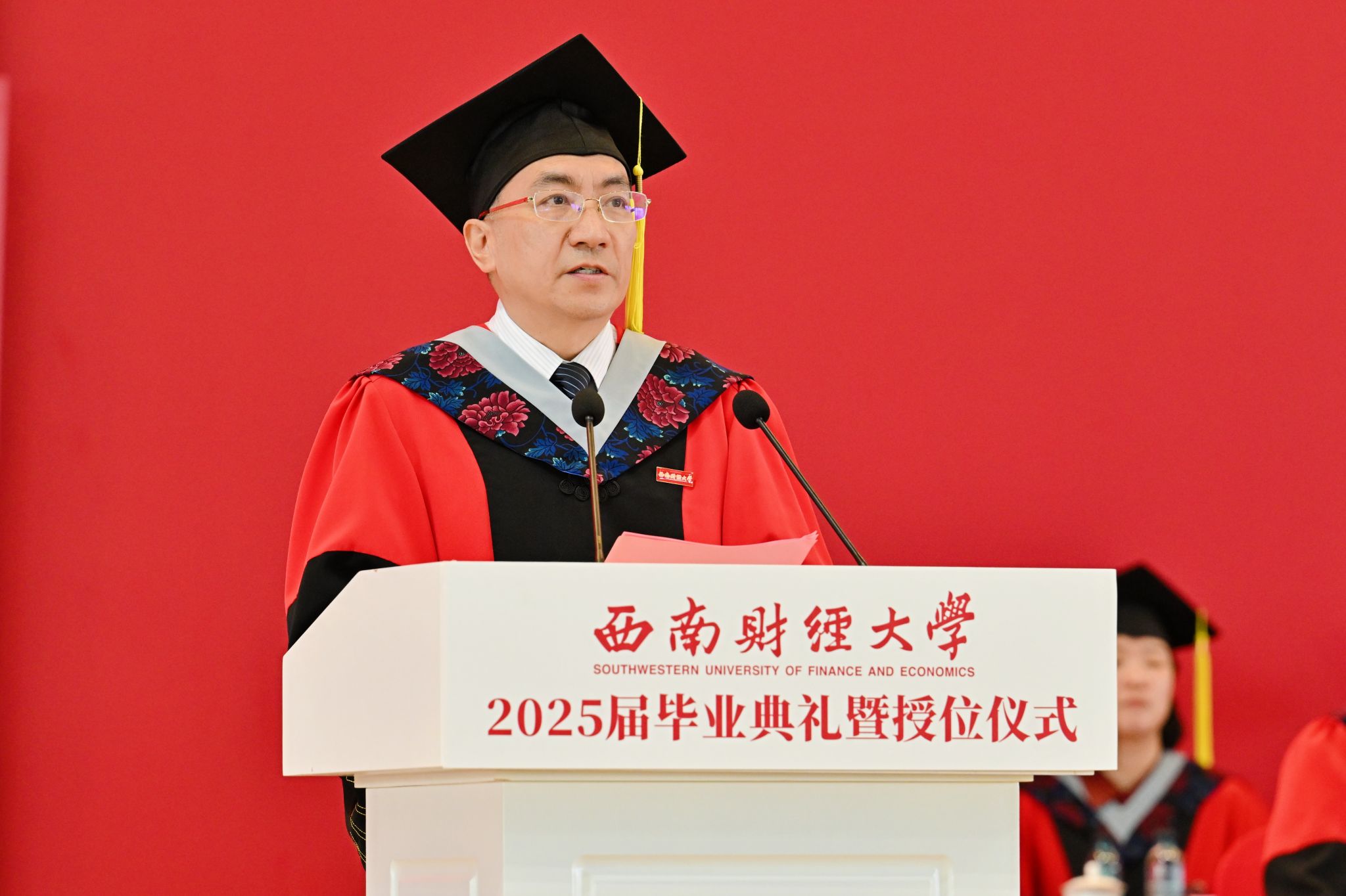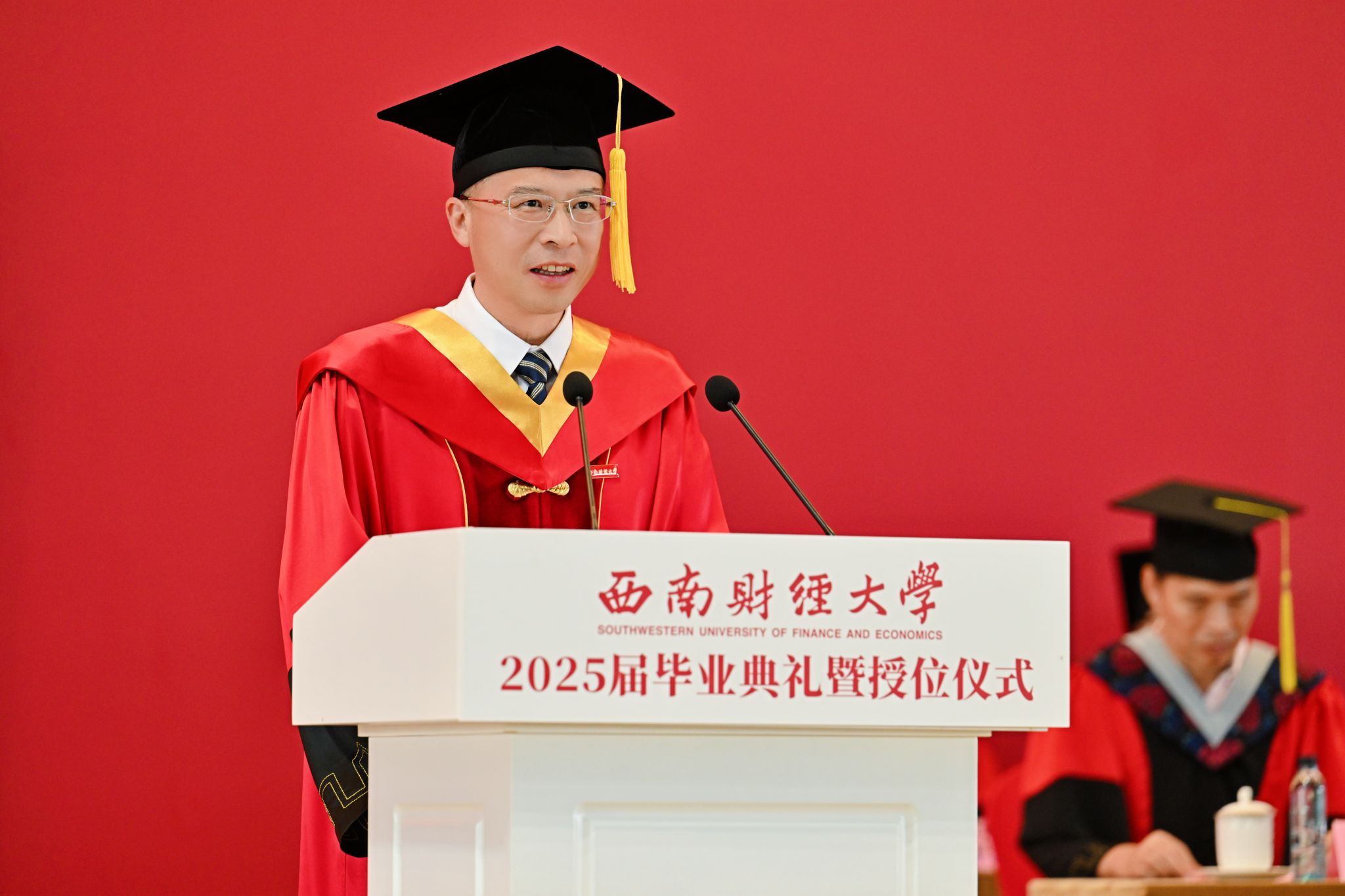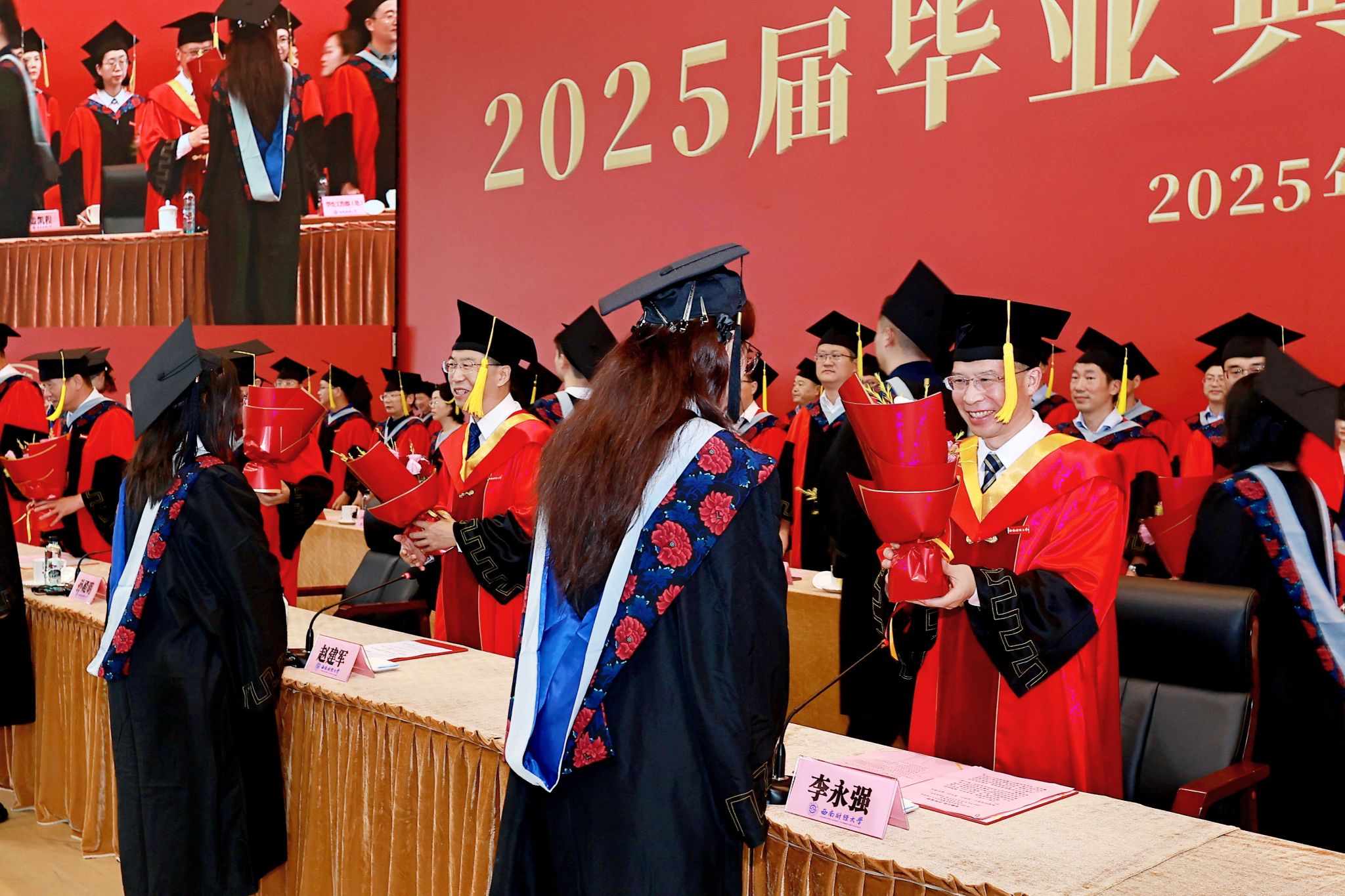 学校学位评定委员会副主席史代敏宣读授位决定,孙殿明宣读2025届优秀大学毕业生、2025年度优秀博士、硕士学位论文光华奖的表彰决定。校领导为毕业生代表颁发毕业证书和学位证书,向获奖代表颁奖。