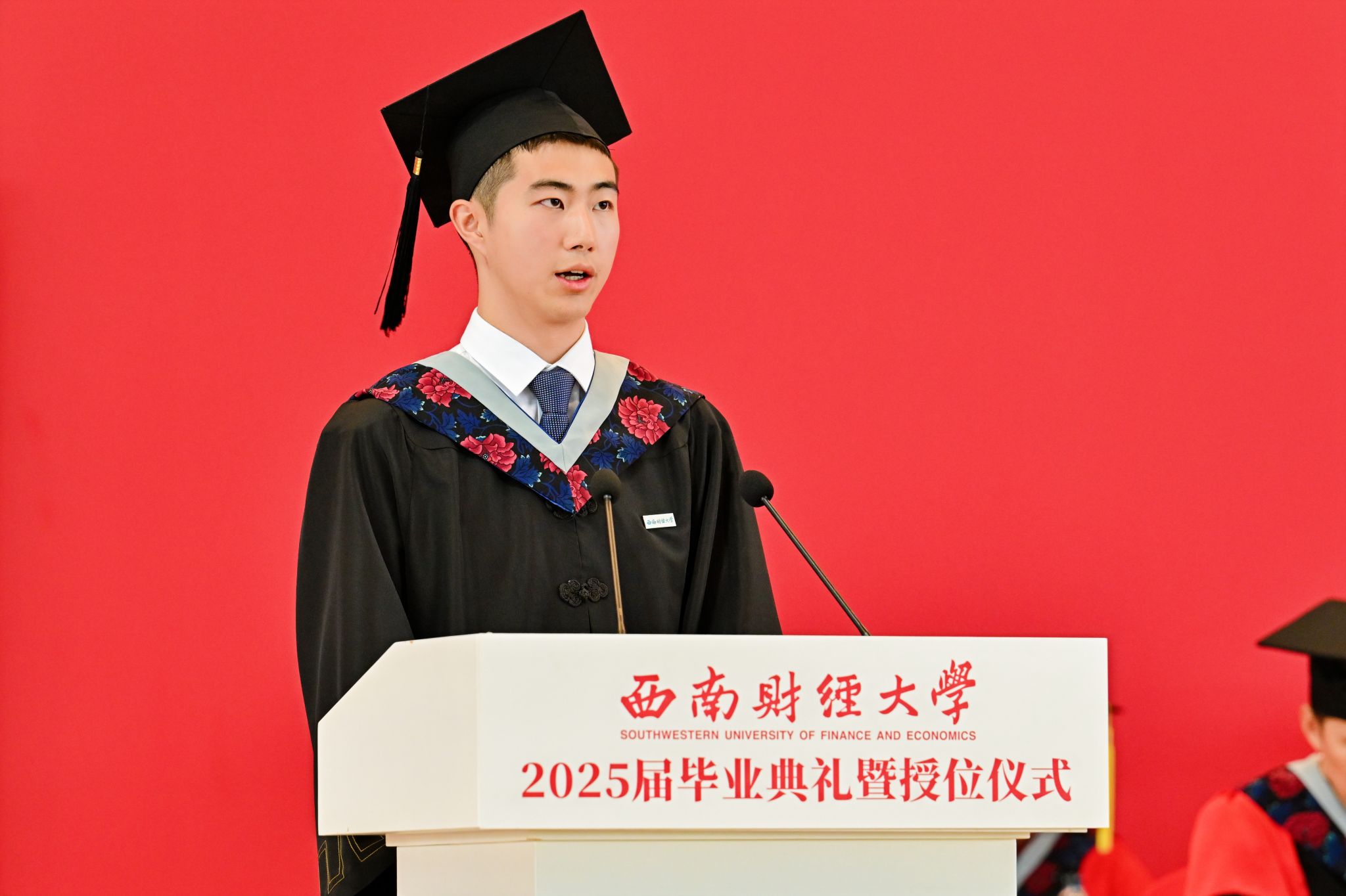 毕业生代表何昳矾发言,与在场师生共同回首难忘的必赢岁月,表示将始终铭记“经世济民、孜孜以求”的必赢精神,努力以青春之我诠释必赢人的责任与担当。